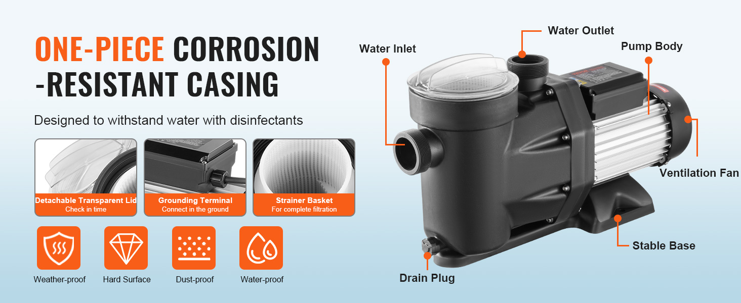 Naše bazénové čerpadlo má robustný, zosilnený PP plášť navrhnutý pre maximálnu životnosť a výnimočnú odolnosť proti korózii. Ventilačná konštrukcia zlepšuje rozptyl tepla, udržiava optimálny výkon a predlžuje životnosť vášho zariadenia.