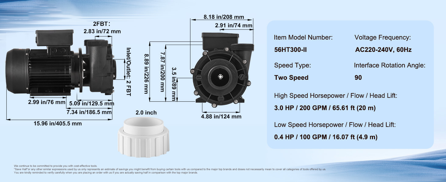 Naše SPA čerpadlo pre vírivku má dvojrýchlostnú konštrukciu, vysoká rýchlosť 1600 W / nízka rýchlosť 400 W, a priložené 2-palcové vstupné a výstupné otvory sa dokonale hodia k existujúcej vani. Motor z čistej medi prešiel 80 000-násobným testom elektrického cyklu v kombinácii s ložiskami proti vŕzganiu pre hladký chod.