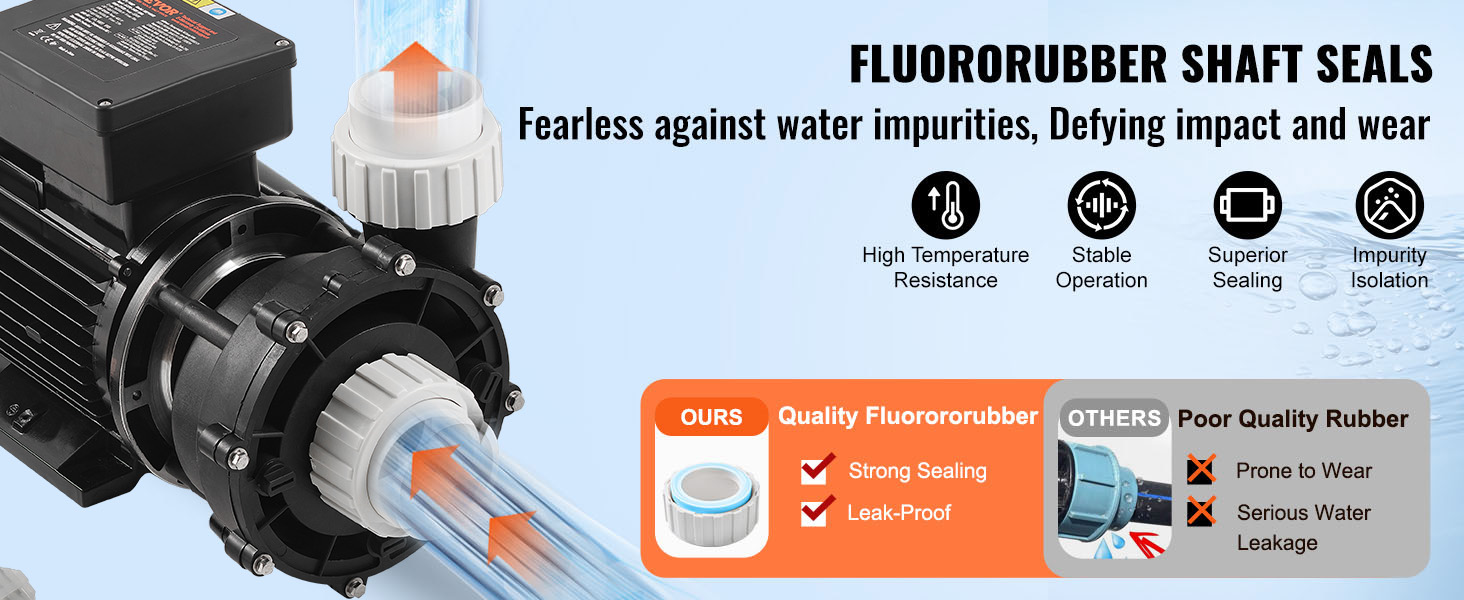 Kľúčom k čerpadlu SPA pre vírivky je ochrana proti úniku, preto používame len fluórokaučukové hriadeľové tesnenia, ktoré majú dobrú odolnosť voči vysokým teplotám, korózii, oleju a starnutiu a dokážu si udržať stabilný tesniaci výkon v náročných pracovných podmienkach.