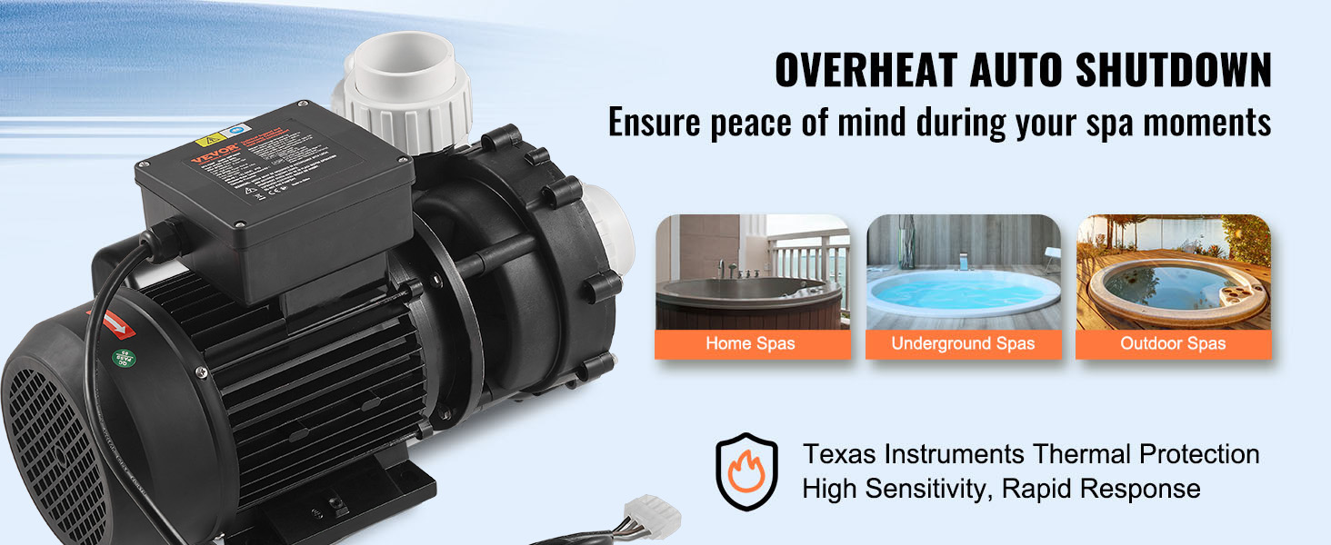 Toto čerpadlo SPA pre vírivky je vybavené tepelnou ochranou Texas Instruments, ktorá sa vyznačuje vysokou presnosťou, rýchlou odozvou a nízkou spotrebou energie. Keď teplota motora prekročí nastavenú hodnotu, automaticky odpojí obvod, aby ochránila motor pred poškodením.