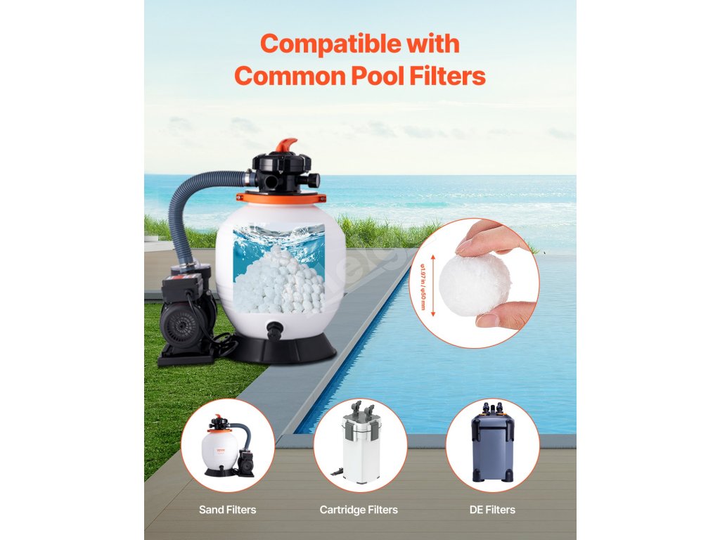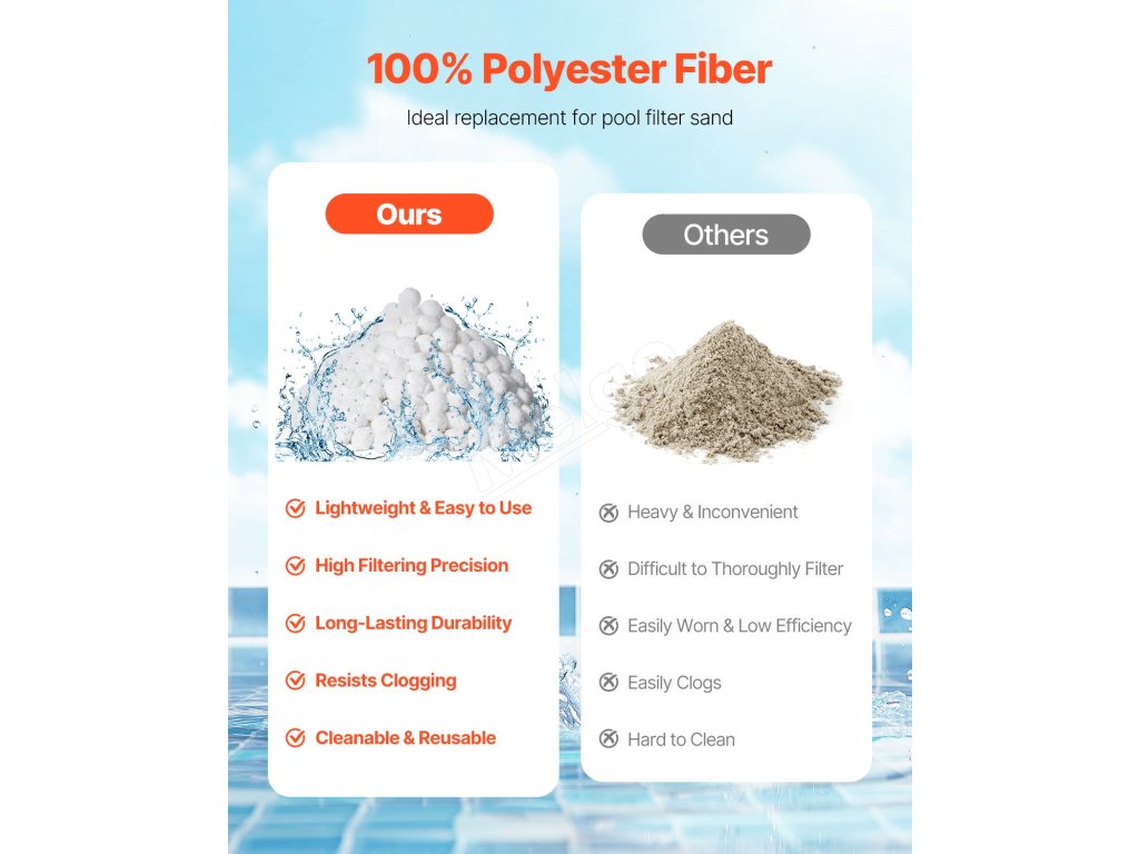 Zlepšite svoju filtráciu pomocou našich bazénových filtračných guľôčok vyrobených zo 100 % prvotriedneho polyesterového vlákna. Naše guličky prinášajú vynikajúci filtračný výkon, sú kompatibilné s rôznymi filtračnými systémami, ako sú pieskové filtre, kartušové filtre a DE filtre. Vychutnajte si kúpanie v krištáľovo čistej vode za okamih!