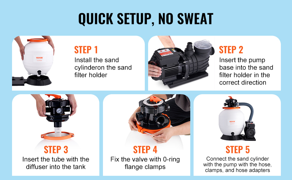Naše čerpadlo pieskového filtra, ktoré bolo navrhnuté s ohľadom na jednoduchosť, sa vyznačuje jednoduchým procesom nastavenia. Dokonca aj začínajúci používatelia ho môžu ľahko nainštalovať bez zložitých krokov alebo špecializovaného náradia - stačí zapojiť a hrať.