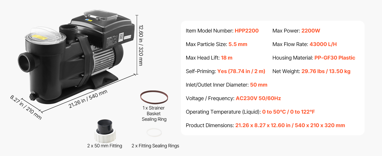 S maximálnym výkonom 2200 W, maximálnou výškou zdvihu 18 m, maximálnym prietokom 43 000 l/h a reguláciou otáčok v rozmedzí 1150 až 3600 ot/min zabezpečuje toto bazénové čerpadlo silnú cirkuláciu a vysoko účinnú filtráciu, vďaka čomu zostane voda vo vašom bazéne čistá a priezračná.