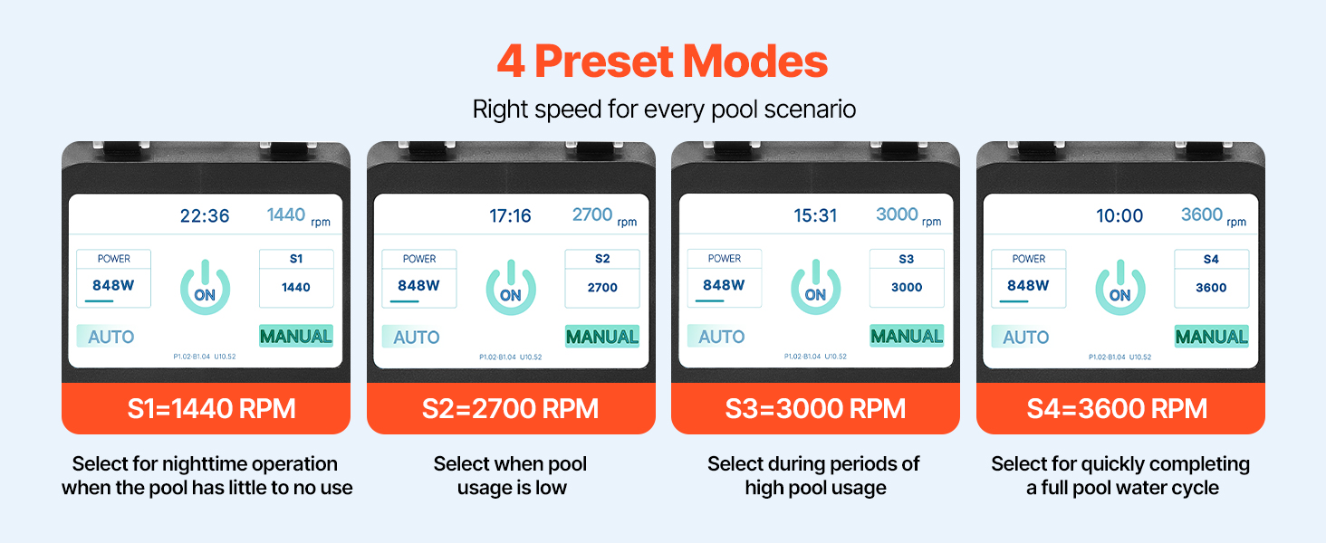 LCD displej na tomto čerpadle pre zapustené a nadzemné bazény zobrazuje stav v reálnom čase, zatiaľ čo 4 prednastavené režimy, výber jedným dotykom a 24-hodinová automatická prevádzka zaisťujú jednoduché a pohodlné každodenné používanie.