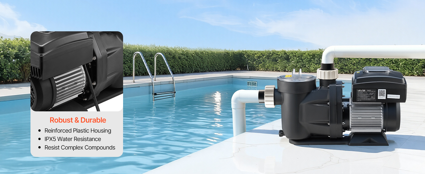 Toto bazénové čerpadlo je vybavené vysokoúčinným motorom s permanentnými magnetmi pre plynulý a tichý chod, má zosilnené puzdro a odolnosť proti vode IPX5, čím zabezpečuje spoľahlivú prevádzku v náročných bazénových prostrediach.