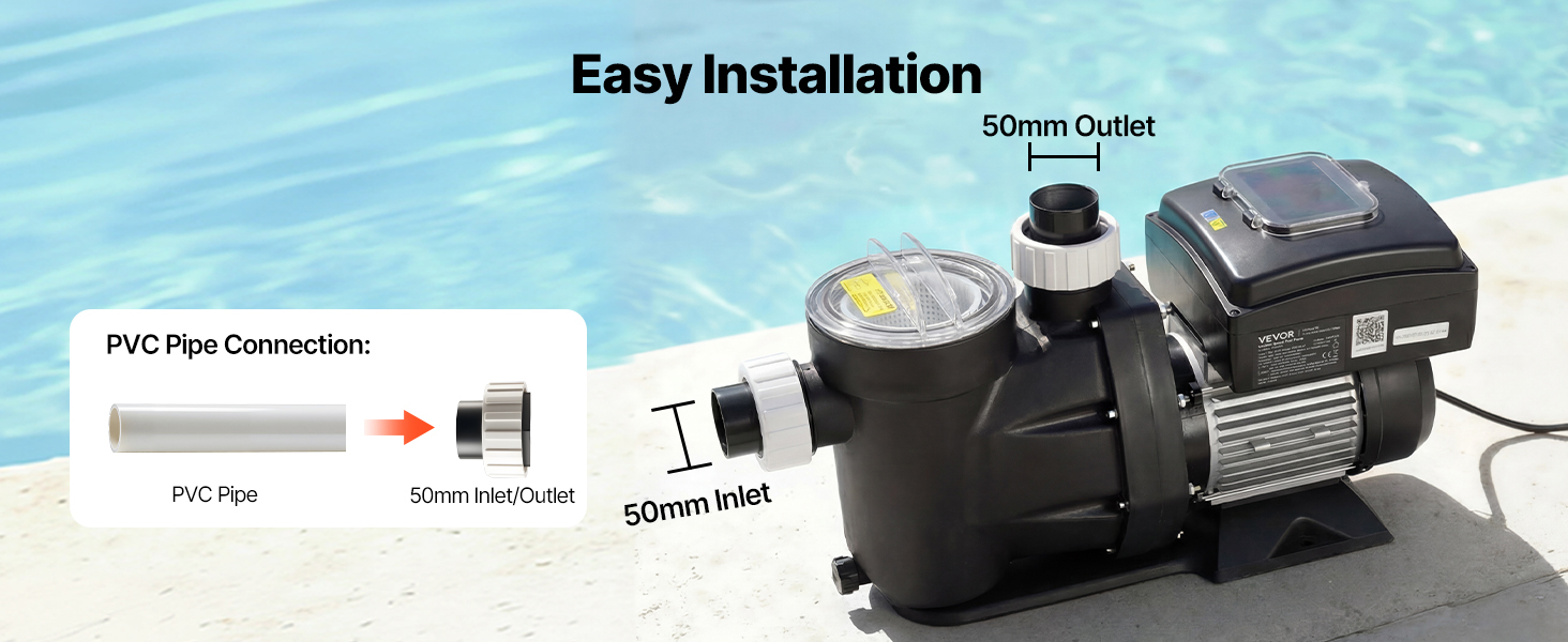 Toto bazénové čerpadlo s premenlivou rýchlosťou podporuje ako PVC rúrky, tak aj ohybné PVC hadice, čo umožňuje rýchle a jednoduché pripojenie len v niekoľkých jednoduchých krokoch.