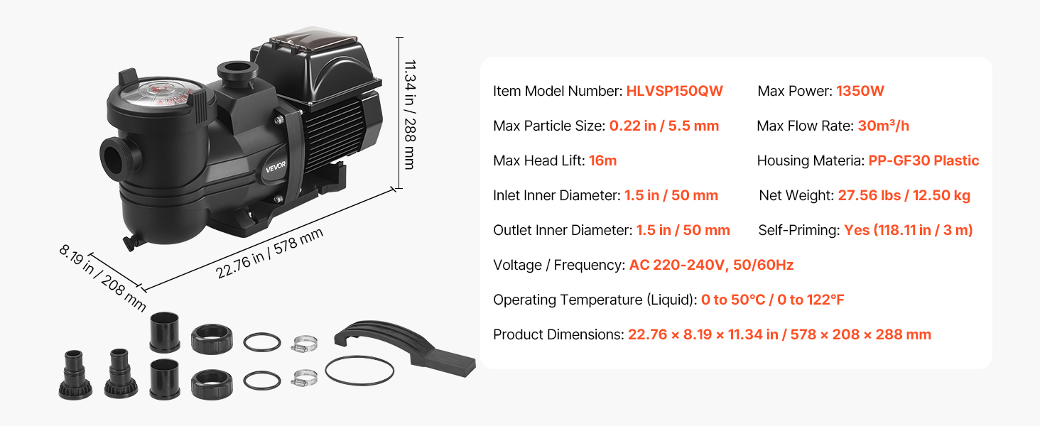 S maximálnym výkonom 1350 W, maximálnou výškou 16 m, maximálnym prietokom 30 000 l/h a reguláciou rýchlosti 1000–2900 ot/min toto bazénové čerpadlo zabezpečuje silnú cirkuláciu a vysoko účinnú filtráciu, aby voda vo vašom bazéne zostala čistá a priezračná.