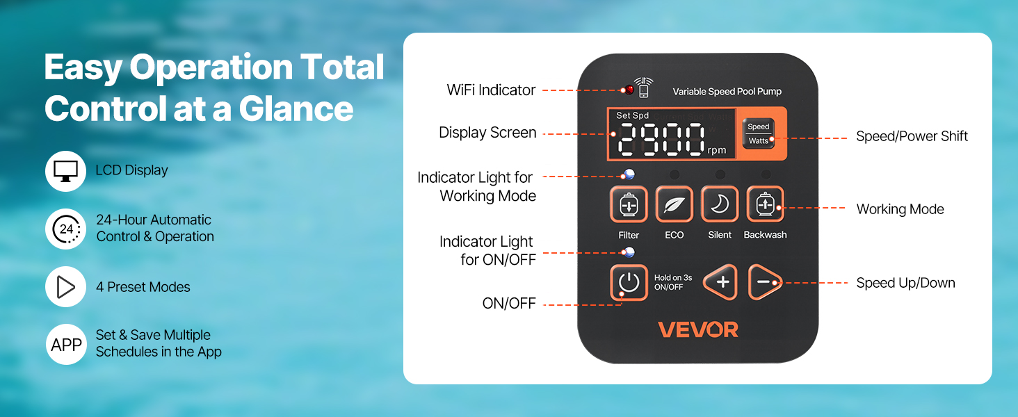 LCD displej na tomto čerpadle do bazénov v/nad zemou zobrazuje stav v reálnom čase, zatiaľ čo 4 prednastavené režimy, výber jedným dotykom a 24-hodinová automatická prevádzka zaisťujú jednoduché a pohodlné každodenné používanie.