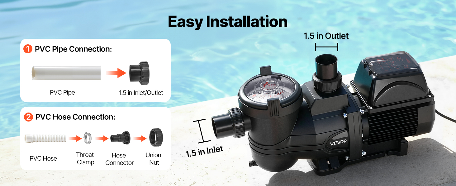 Toto bazénové čerpadlo s premenlivou rýchlosťou podporuje ako PVC rúrky, tak aj flexibilné PVC hadice, čo umožňuje rýchle a jednoduché pripojenie v niekoľkých ľahkých krokoch.