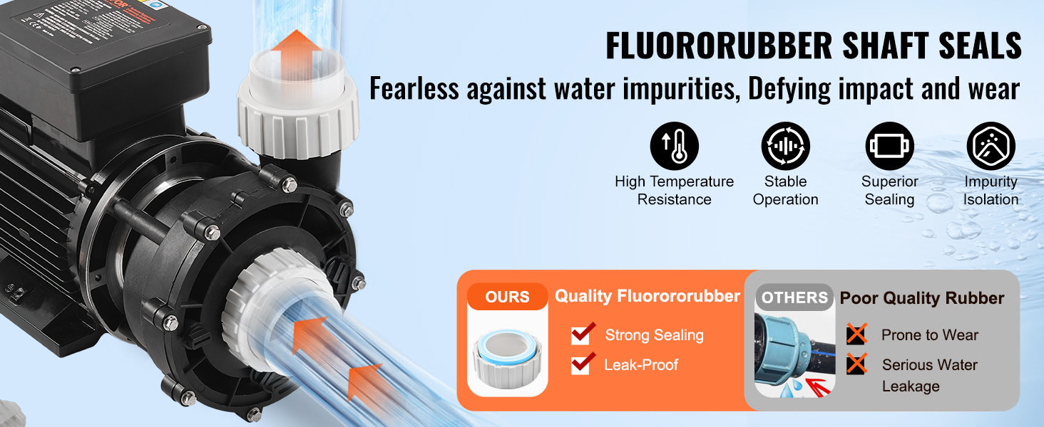 Kľúčom k čerpadlu SPA pre vírivky je ochrana proti úniku, preto používame iba fluórokaučukové tesnenia hriadeľa, ktoré majú dobrú odolnosť voči vysokým teplotám, korózii, oleju a starnutiu a dokážu si udržať stabilný tesniaci výkon v náročných pracovných podmienkach.