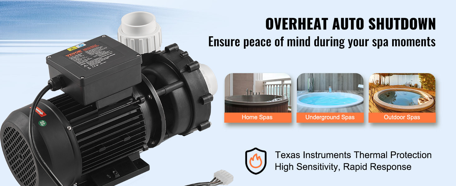 Toto čerpadlo SPA pre vírivky je vybavené tepelnou ochranou Texas Instruments, ktorá sa vyznačuje vysokou presnosťou, rýchlou odozvou a nízkou spotrebou energie. Keď teplota motora prekročí nastavenú hodnotu, automaticky odpojí obvod, aby ochránila motor pred poškodením.