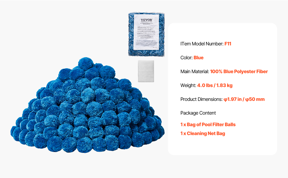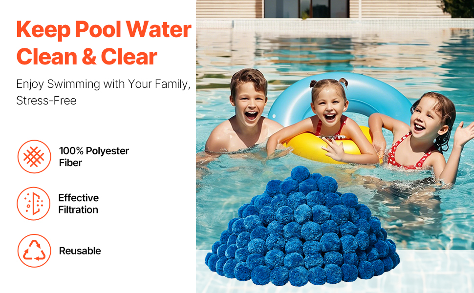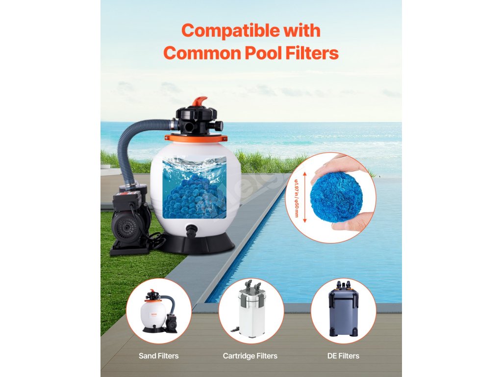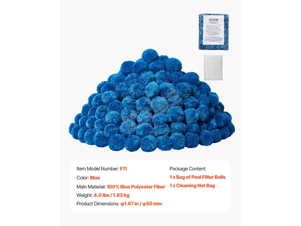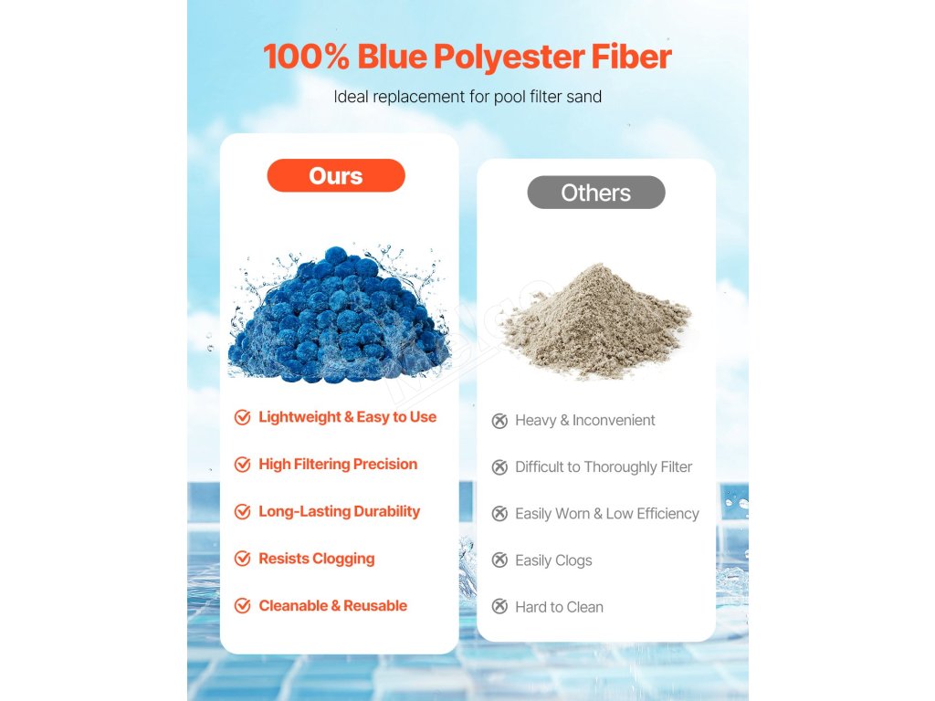 Zlepšite svoju filtráciu pomocou našich bazénových filtračných guličiek, ktoré sú vyrobené zo 100 % modrého polyesterového vlákna. Naše guľôčky prinášajú vynikajúci filtračný výkon, sú kompatibilné s rôznymi filtračnými systémami, ako sú pieskové filtre, kartušové filtre a DE filtre. Vychutnajte si kúpanie v krištáľovo čistej vode za okamih!
