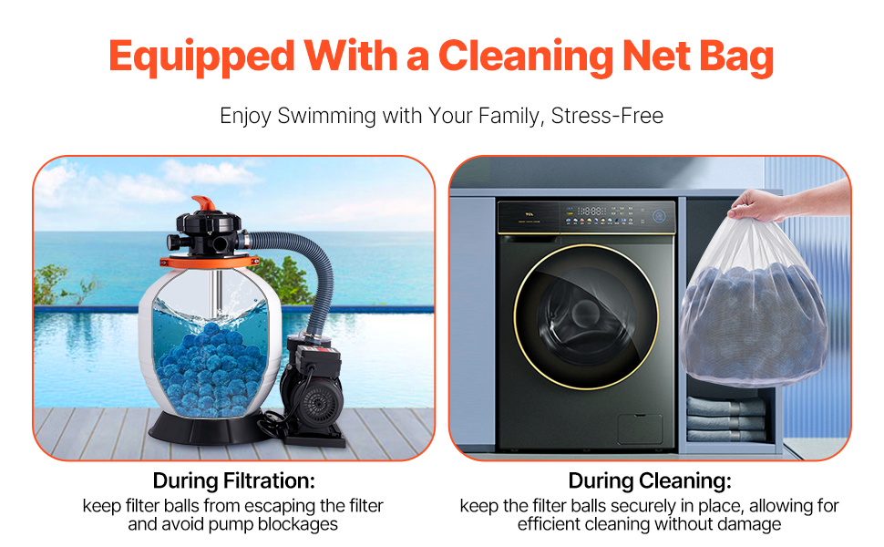 Filtračné guľôčky do bazéna sa dodávajú s čistiacim sieťovým vreckom, ktoré je určené na použitie s filtračnými guľôčkami, čím sa zabráni akémukoľvek upchatiu vášho filtračného systému. Nemusíte sa obávať upchatia, len bezproblémovej filtrácie a údržby.