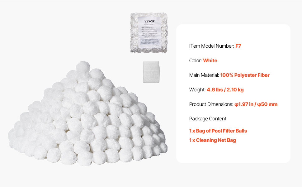 Zlepšite svoju filtráciu pomocou našich bazénových filtračných guľôčok vyrobených zo 100 % prvotriedneho polyesterového vlákna. Naše guličky prinášajú vynikajúci filtračný výkon, sú kompatibilné s rôznymi filtračnými systémami, ako sú pieskové filtre, kartušové filtre a DE filtre. Vychutnajte si kúpanie v krištáľovo čistej vode za okamih!