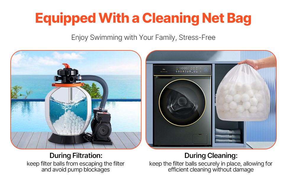 Filtračné guľôčky do bazéna sa dodávajú s čistiacim sieťovým vreckom, ktoré je určené na použitie s filtračnými guľôčkami, čím sa zabráni akémukoľvek upchatiu vášho filtračného systému. Nemusíte sa obávať upchatia, len bezproblémovej filtrácie a údržby.