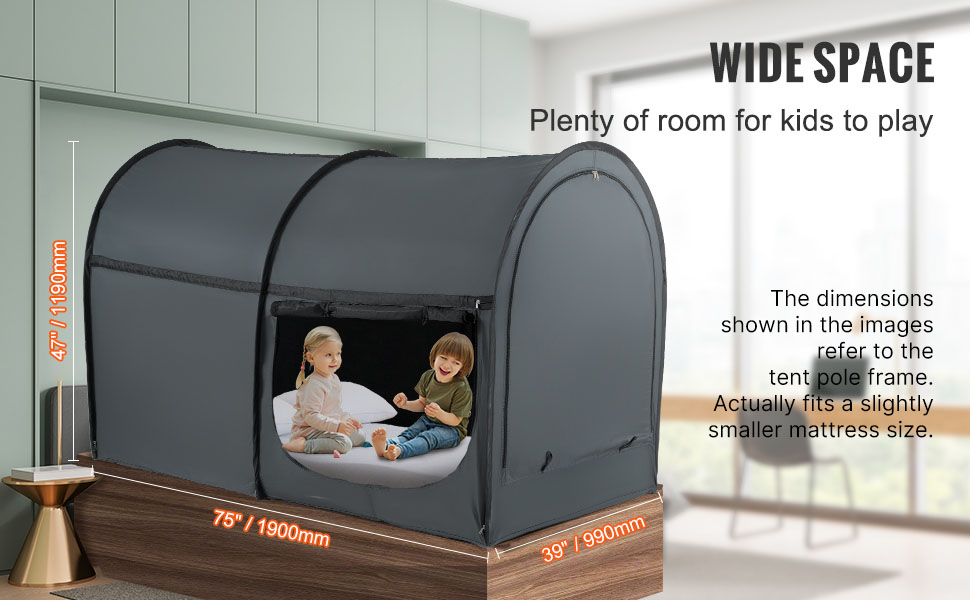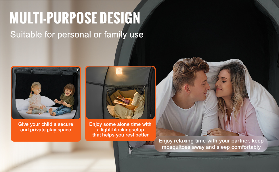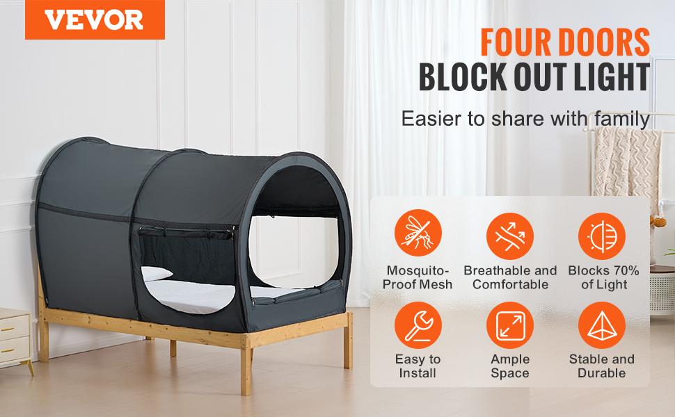 Posteľný stan s rozmermi 75" x 39" x 47" (1900 x 990 x 1190 mm) poskytuje blokovanie svetla pre súkromie v akomkoľvek priestore. Je vybavený štyrmi vstupnými bodmi so sieťovinou a látkou na ochranu súkromia, ako aj vreckom na telefón, háčikom na nočné svetlo a suchým zipsom na nabíjanie. Postavený je z pevných tyčí s vláknami a odolnej tkaniny s hmotnosťou 80 g (0,18 kg).