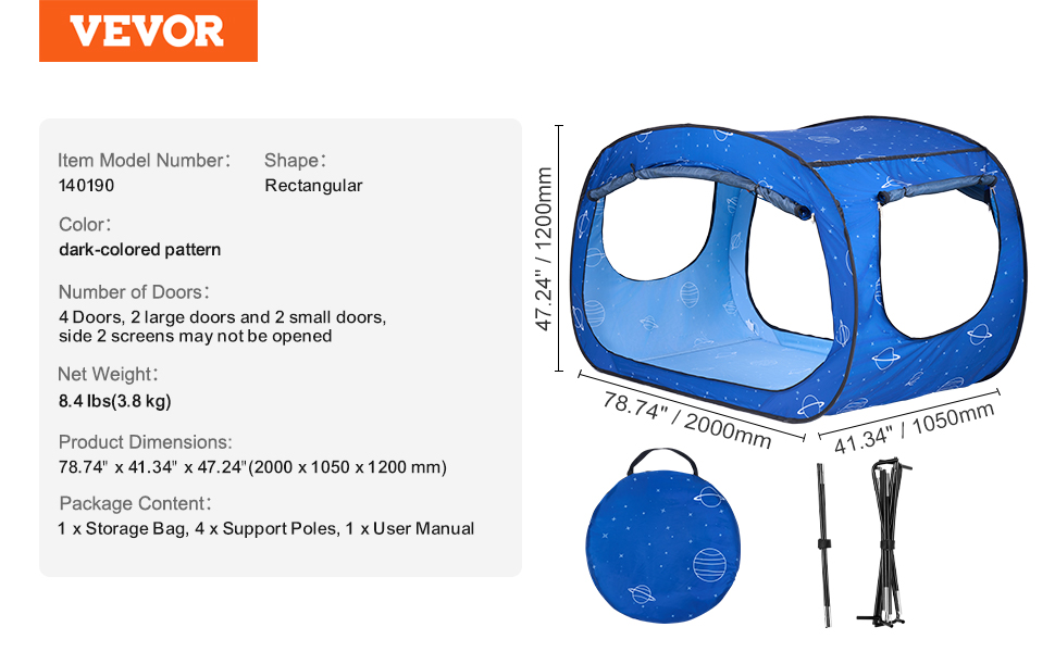 Tento 78,74" x 41,34" x 47,24" (2000 x 1050 x 1200 mm) je vhodný pre členov rodiny alebo priateľov na spoločné používanie, pretože poskytuje dostatok priestoru na aktivity a odpočinok. Okrem toho veľkopriestorový dizajn znižuje pocit uzavretosti a stiesnenosti, vďaka čomu sa budete cítiť uvoľnenejšie a pokojnejšie.