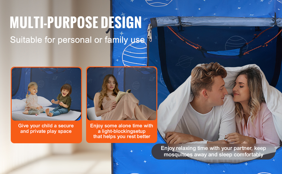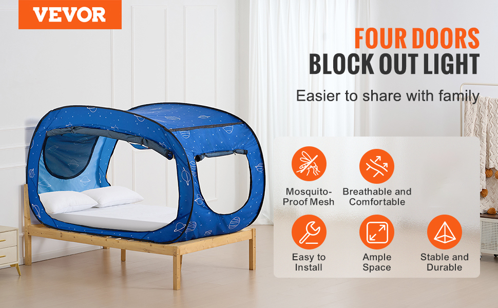 Posteľný stan s rozmermi 78,74" x 41,34" x 47,24" (2000 x 1050 x 1200 mm) poskytuje blokovanie svetla pre súkromie v akomkoľvek priestore. Je vybavený dvoma vstupnými bodmi so sieťovinou a látkou na ochranu súkromia, ako aj vreckom na telefón, háčikom na nočné svetlo a suchým zipsom na nabíjanie. Postavený je z pevných tyčí s vláknami a odolnej tkaniny s hmotnosťou 80 g (0,18 kg).