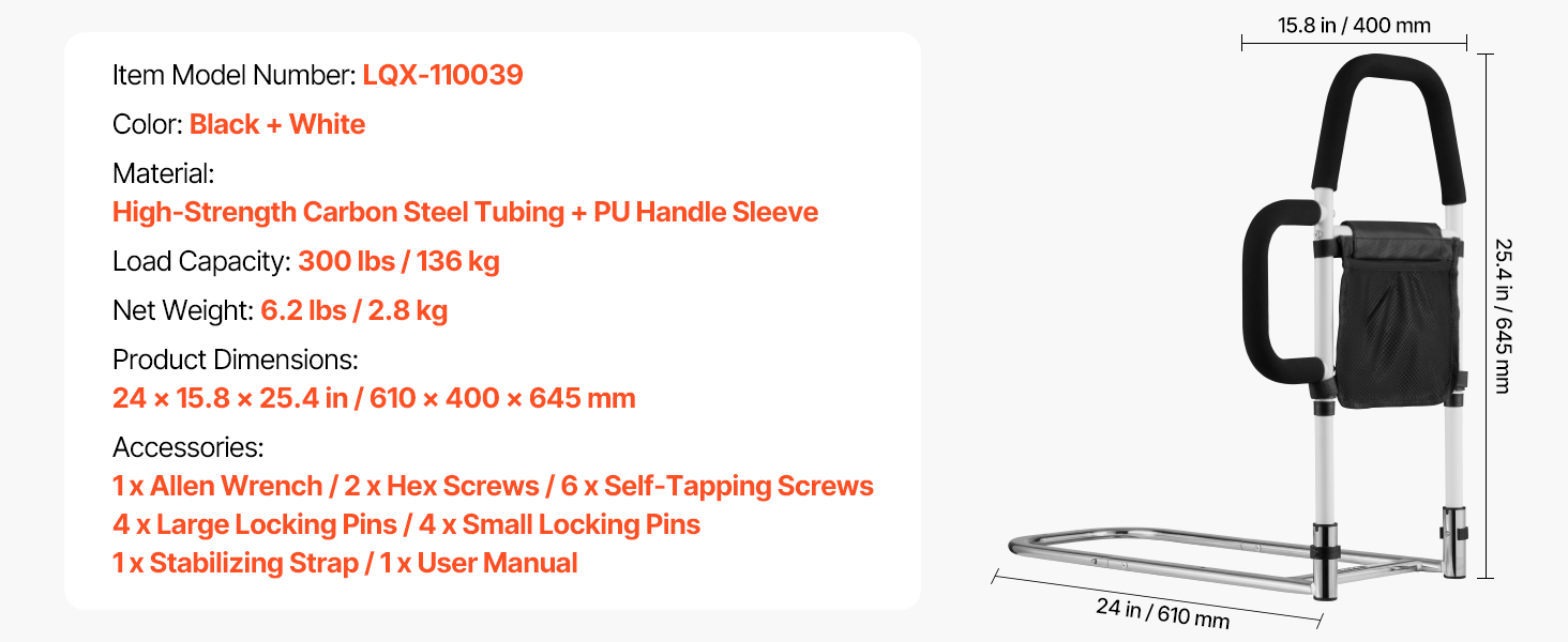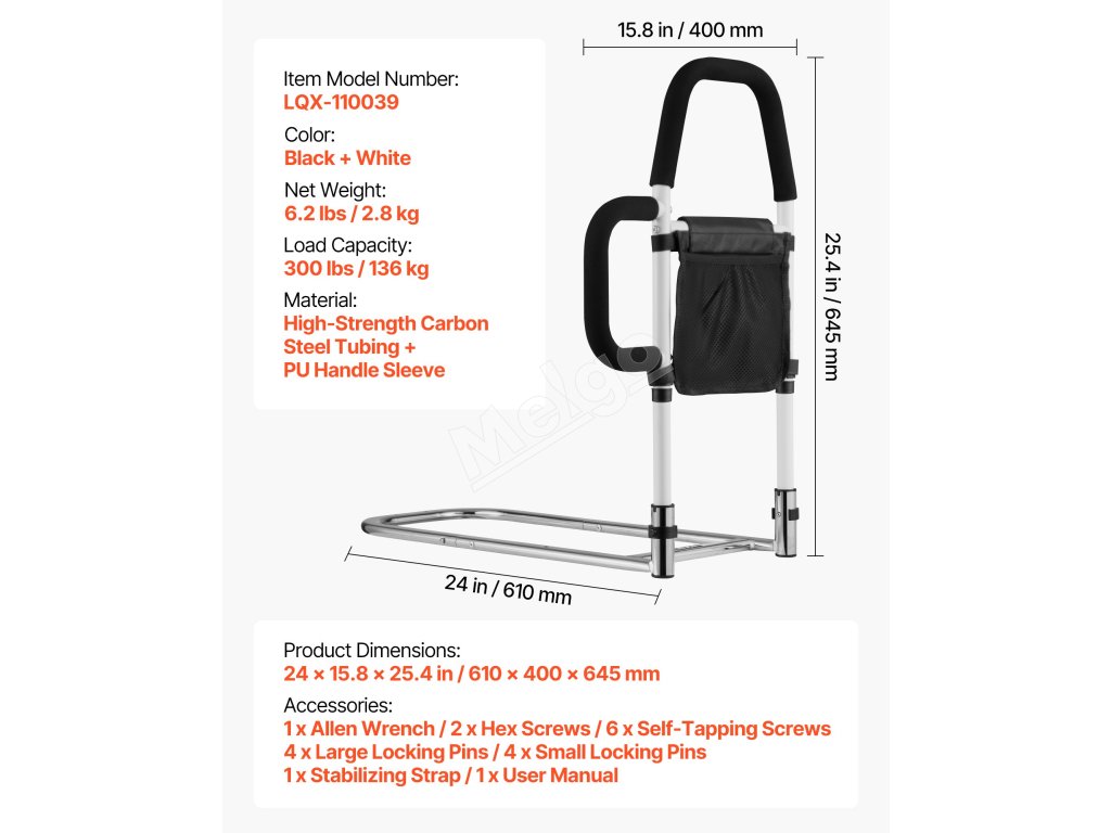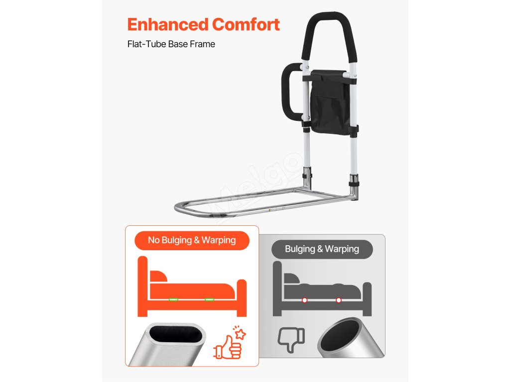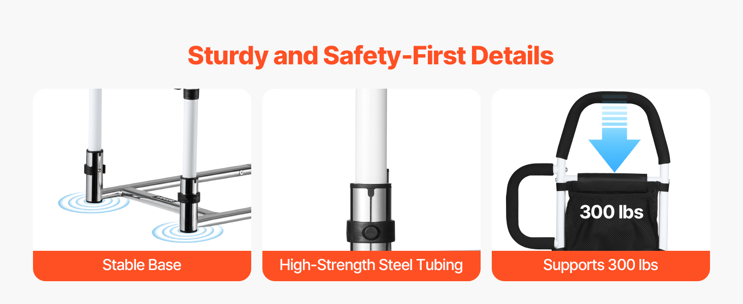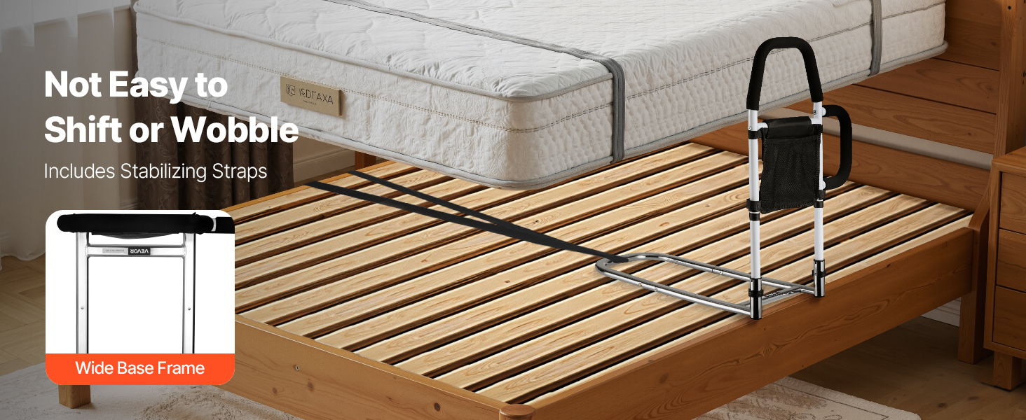 Priložené popruhy bezpečne zaistia zábradlie na mieste, čím sa zabráni jeho kývaniu alebo posúvaniu počas používania. Rozšírený základný rám zväčšuje kontaktnú plochu, čím poskytuje stabilnejšiu oporu.