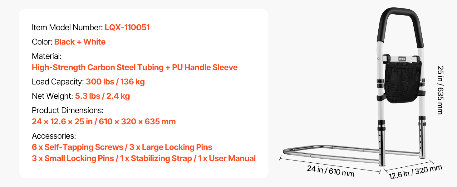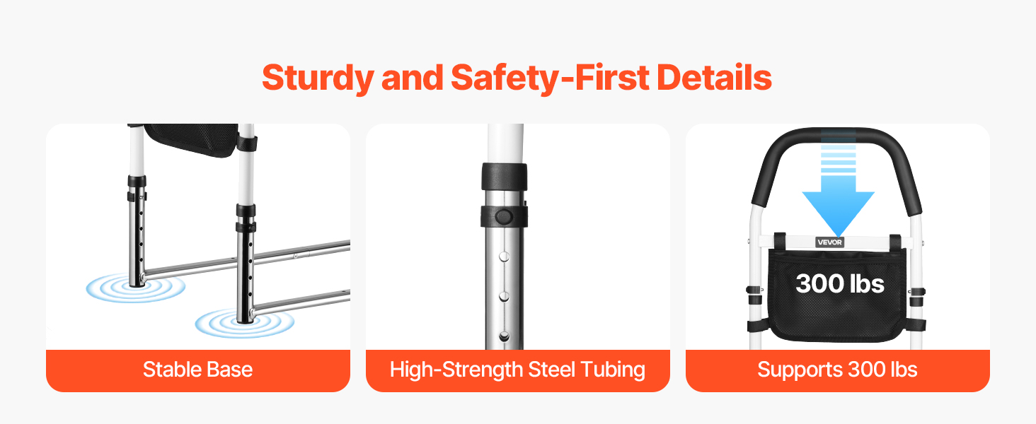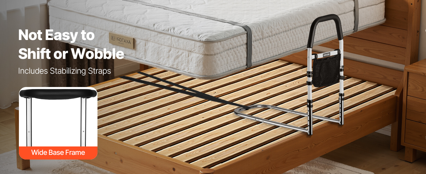 Priložené popruhy bezpečne zaistia zábradlie na mieste, čím sa zabráni jeho kývaniu alebo posúvaniu počas používania. Rozšírený základný rám zväčšuje kontaktnú plochu, čím poskytuje stabilnejšiu oporu.