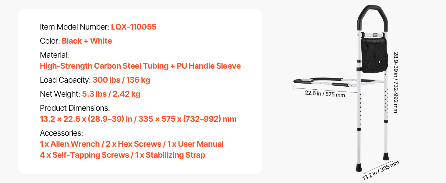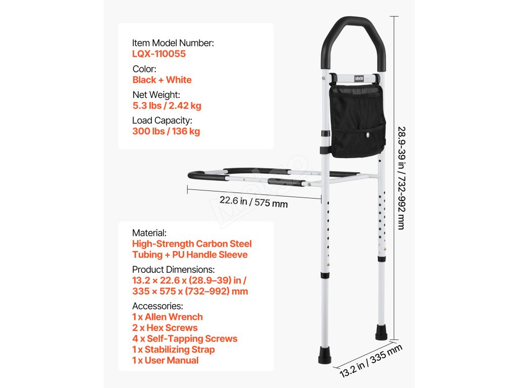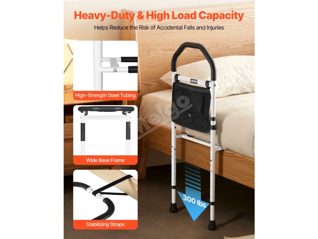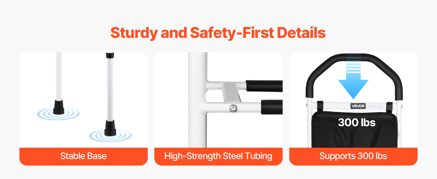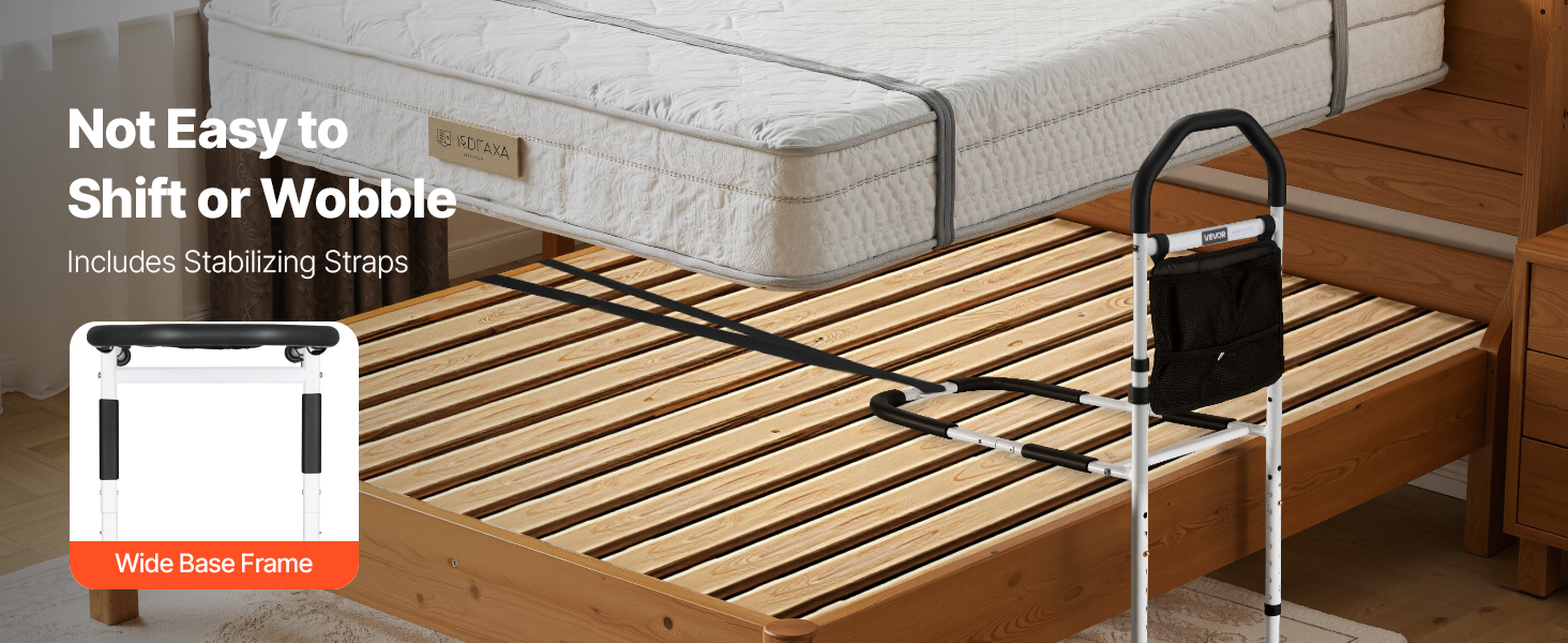 Priložené popruhy bezpečne zaistia zábradlie na mieste, čím sa zabráni jeho kývaniu alebo posúvaniu počas používania. Rozšírený základný rám zväčšuje kontaktnú plochu, čím poskytuje stabilnejšiu oporu.