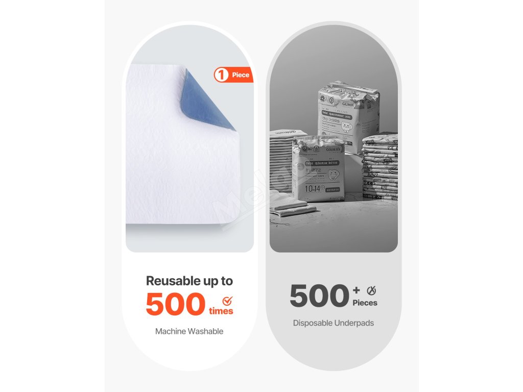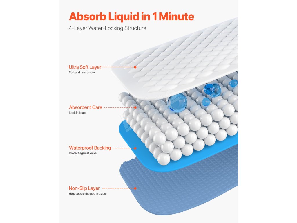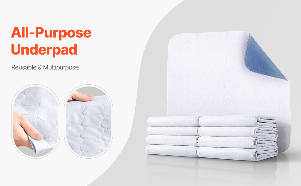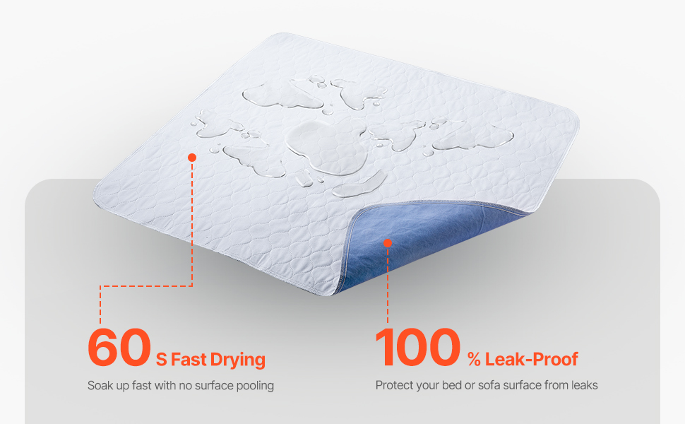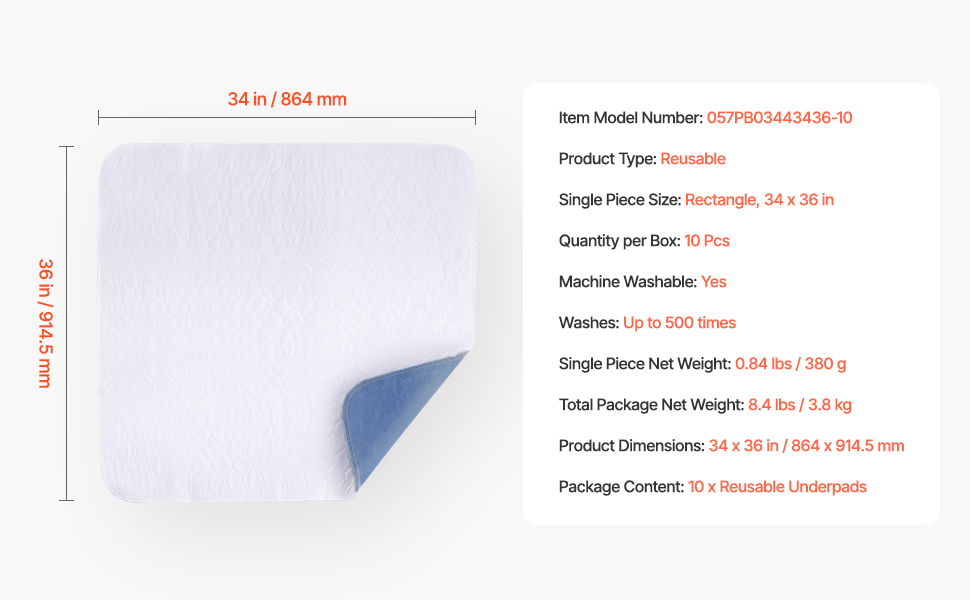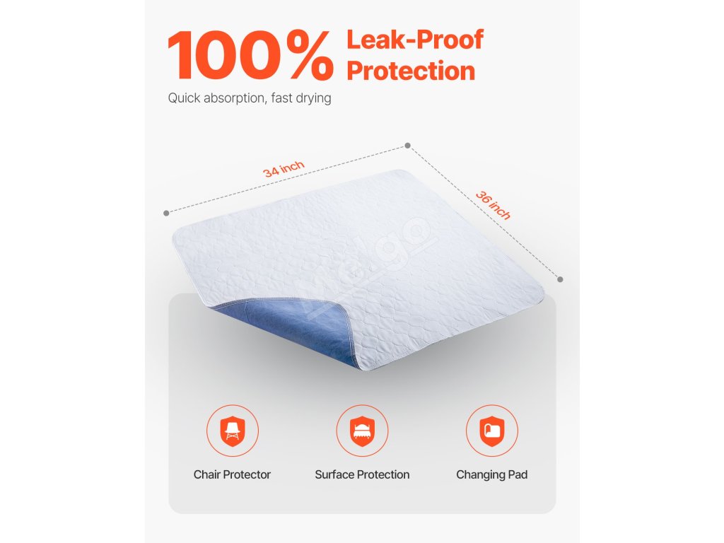 Naše umývateľné podložky s rozmermi 34" x 36" v balení po 10 kusoch poskytujú dlhotrvajúcu a spoľahlivú ochranu povrchu. Tieto opakovane použiteľné podložky do postele sú superabsorpčné, rýchlo schnúce a 100 % nepriepustné, rýchlo zadržiavajú tekutiny a udržujú posteľ, pohovku a matrac v suchu a pohodlí - ideálne pre starších ľudí, dospelých, deti a domáce zvieratá.