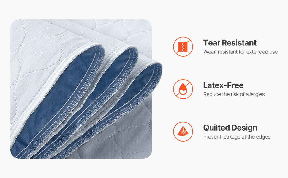 Táto opakovane použiteľná podložka pod posteľ vyrobená z materiálov bez obsahu latexu poskytuje bezpečný a pohodlný zážitok so zníženým rizikom vzniku alergií. Jeho prešívaný dizajn uzatvára tekutinu a zabraňuje presakovaniu na okrajoch, pričom ponúka trvanlivosť a odolnosť proti roztrhnutiu na dlhodobé používanie.