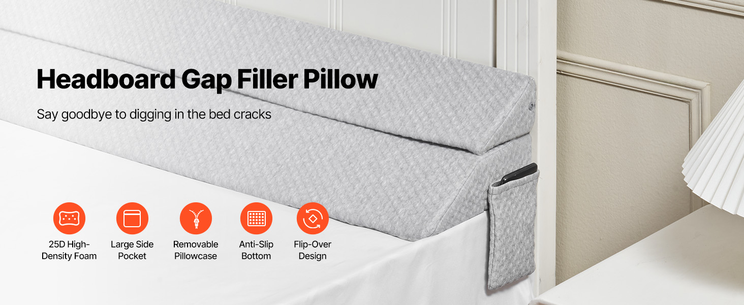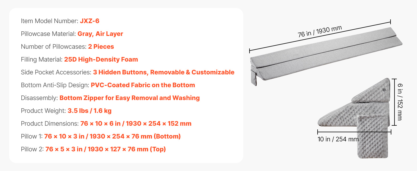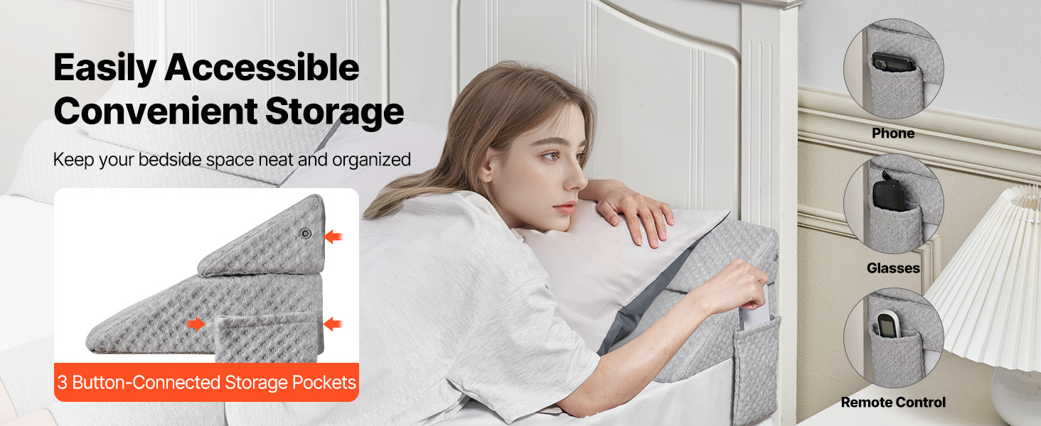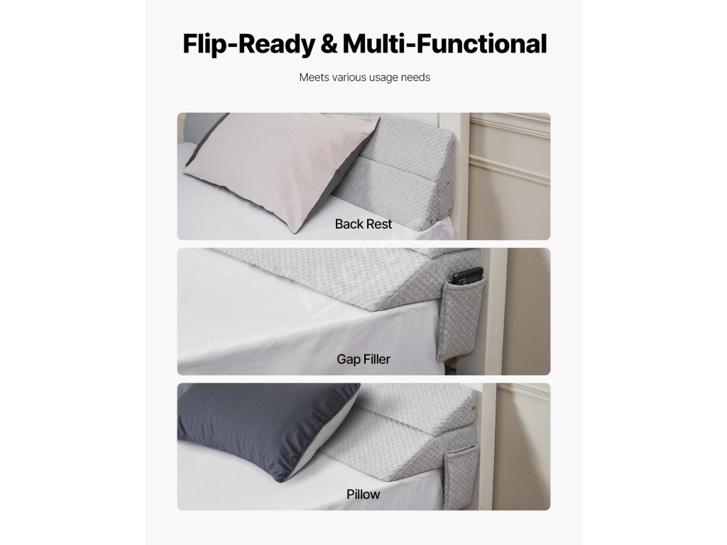 Naša výplň medzier v posteli je vyrobená z 25D peny s vysokou hustotou pre mäkkú oporu a je priedušná. Obsahuje veľké bočné vrecko na telefón, okuliare a diaľkový ovládač. Odnímateľná obliečka na vankúš sa ľahko čistí a protišmykové dno ho udrží na mieste. Funkcia preklápania sa hodí na rôzne použitia.