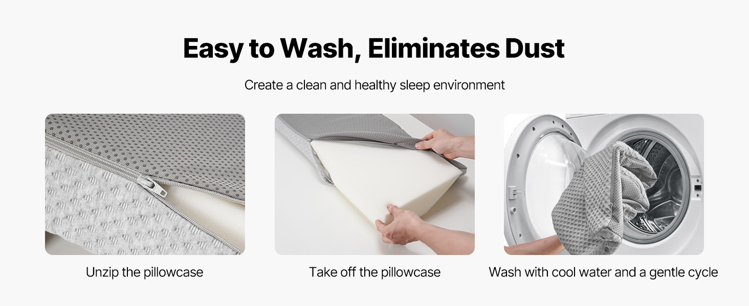 Náš vankúš na vyplnenie medzier v čele postele má odnímateľnú konštrukciu na jednoduché odstránenie, výmenu a čistenie. Možno ho prať v práčke v studenej vode a v šetrných cykloch, čím sa účinne zbaví prachu a nečistôt a zároveň si zachová mäkkosť a pohodlie pre čisté prostredie na spánok.