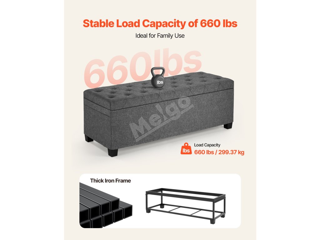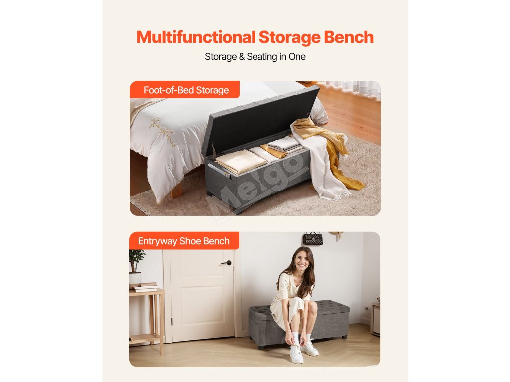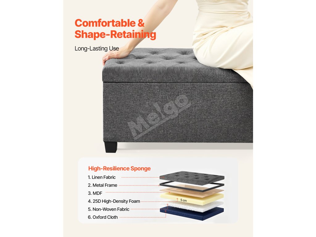 Táto lavica kombinuje štýl a praktickosť, slúži ako sedadlo, podnožka alebo konferenčný stolík a zároveň poskytuje priestranný úložný priestor. Vysoko odolný vankúš zaručuje pohodlie a silnú nosnosť, udržiava si tvar aj pri dlhodobom používaní a hodí sa k rôznym štýlom interiéru.
