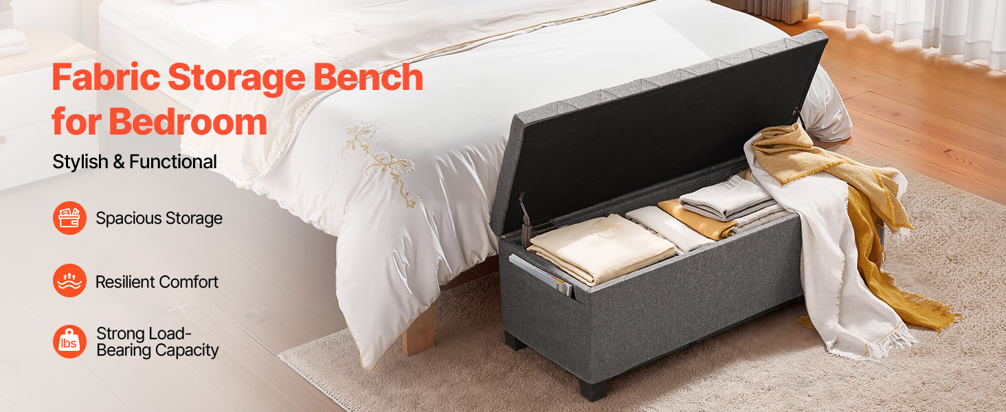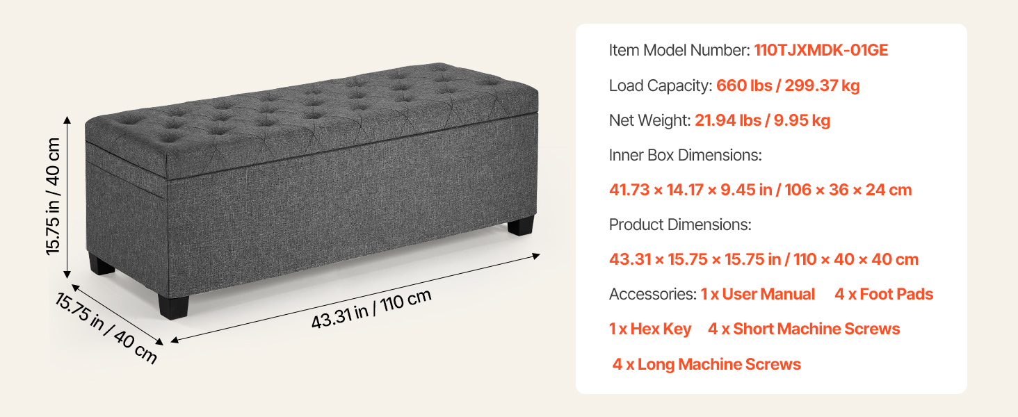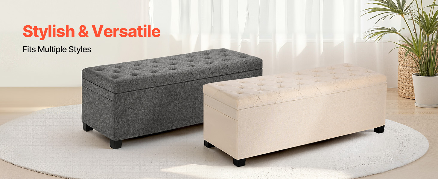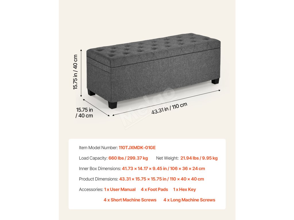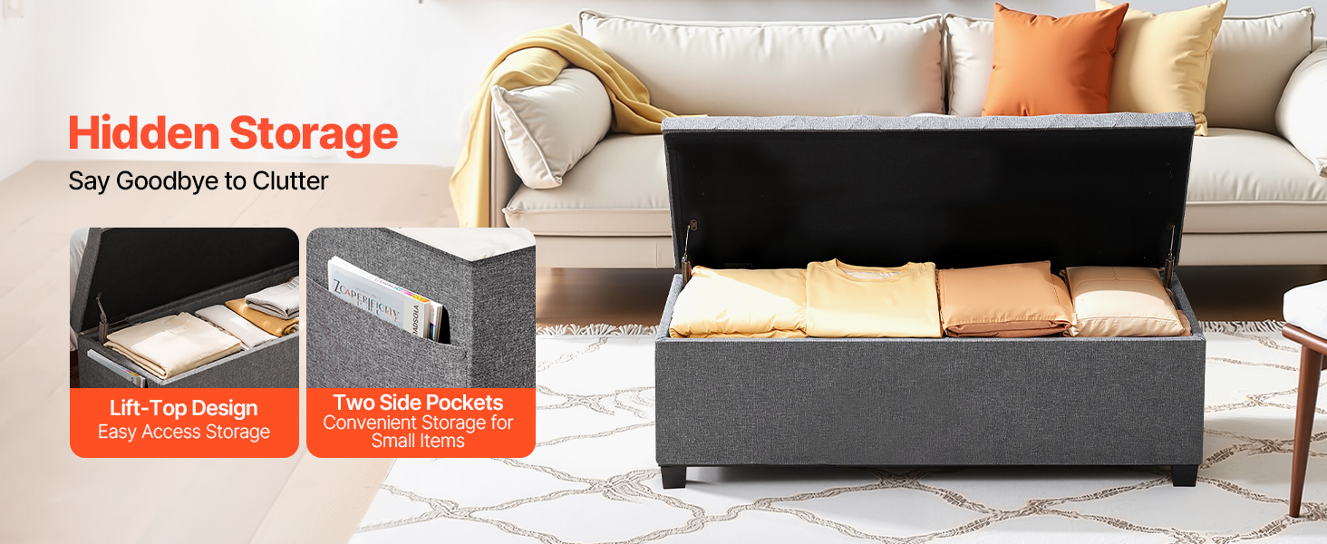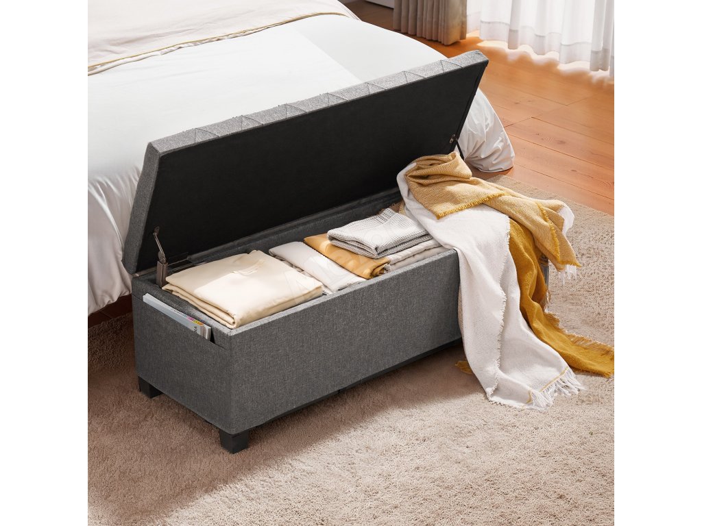 Naša úložná lavica otoman, navrhnutá s výklopným vekom, poskytuje priestranný vnútorný priestor na uloženie posteľnej bielizne, kníh alebo vecí dennej potreby. Do jej dvoch bočných vreciek možno uložiť drobné predmety, ako sú diaľkové ovládače alebo telefóny. Táto úložná lavica nielen šetrí miesto a umožňuje rýchlo nájsť to, čo potrebujete.