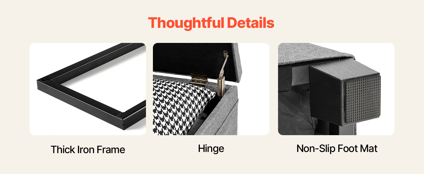 Náš otoman s úložným priestorom má zosilnený železný rám a prvotriedne pánty, ktoré poskytujú spoľahlivú oporu. Protišmykové podložky chránia podlahu pred poškriabaním a posúvaním, čím zabezpečujú jej stabilitu počas používania. Každý detail je navrhnutý pre pohodlie a pokoj na duši.