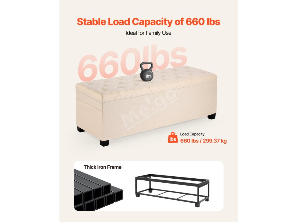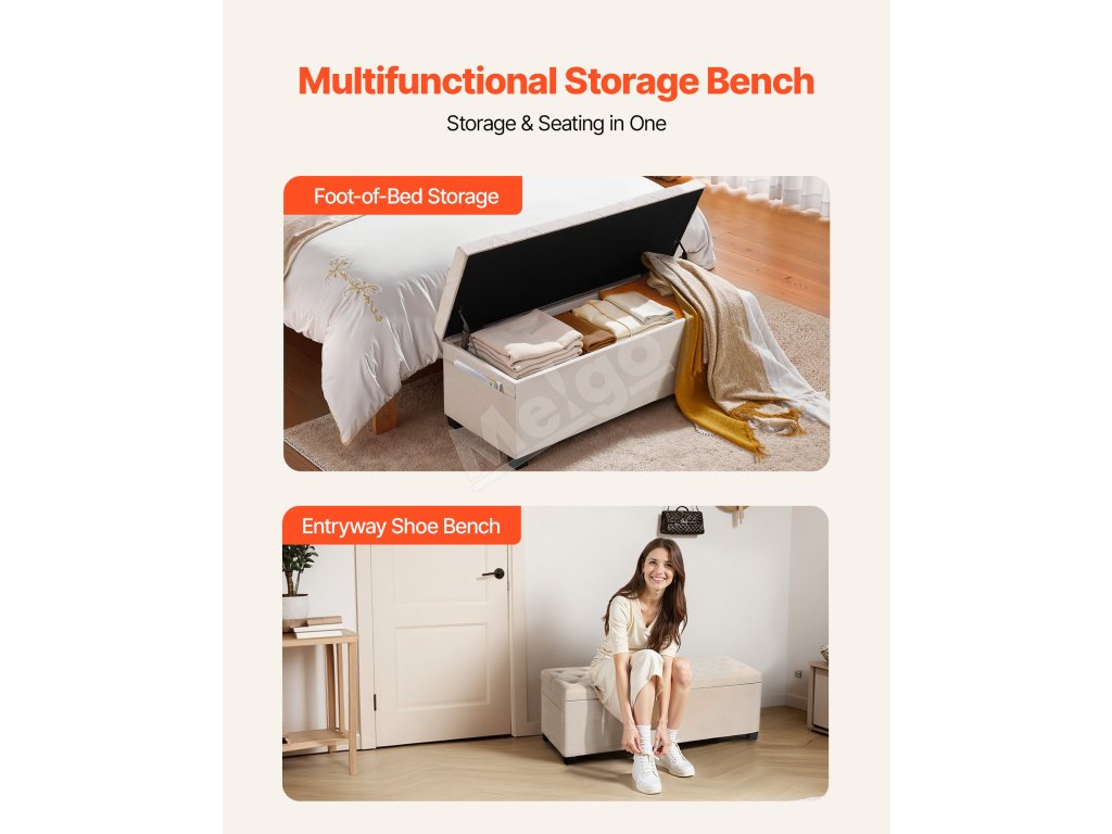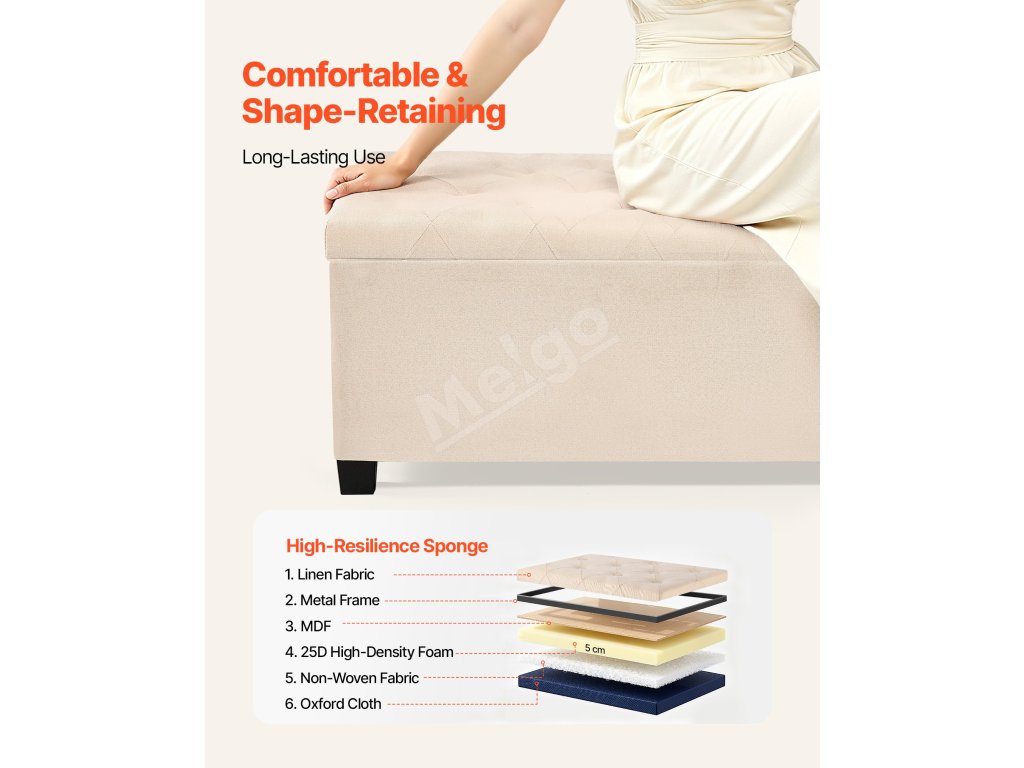Táto lavica kombinuje štýl a praktickosť, slúži ako sedadlo, podnožka alebo konferenčný stolík a zároveň poskytuje priestranný úložný priestor. Vysoko odolný vankúš zaručuje pohodlie a silnú nosnosť, udržiava si tvar aj pri dlhodobom používaní a hodí sa k rôznym štýlom interiéru.