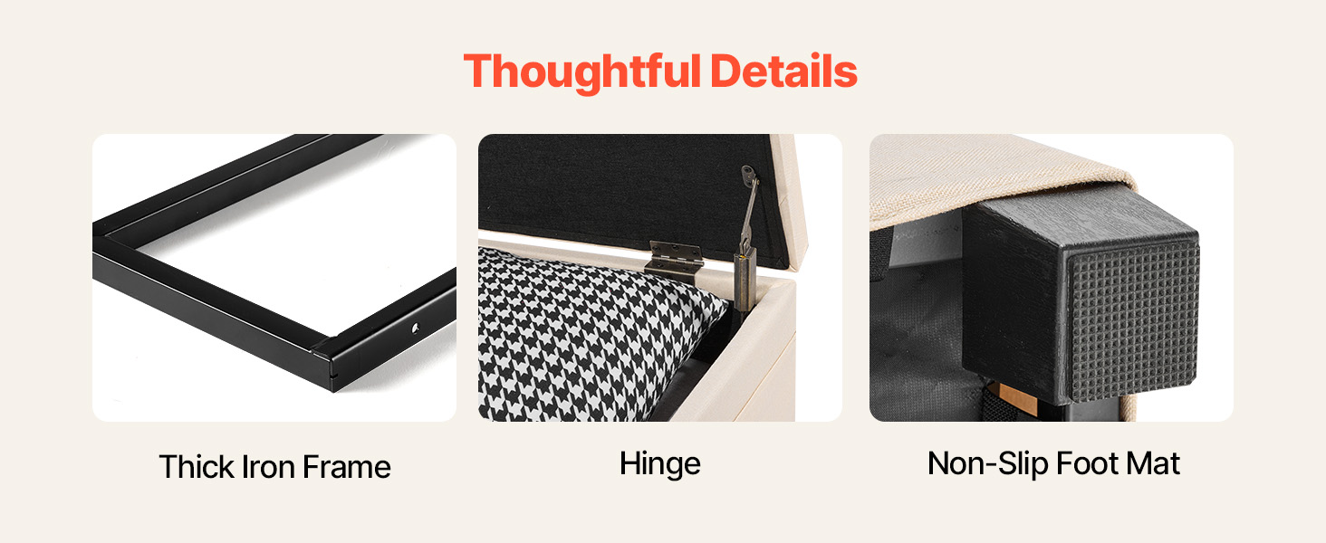 Náš otoman s úložným priestorom má zosilnený železný rám a prvotriedne pánty, ktoré poskytujú spoľahlivú oporu. Protišmykové podložky chránia podlahu pred poškriabaním a posúvaním, čím zabezpečujú jej stabilitu počas používania. Každý detail je navrhnutý pre pohodlie a pokoj na duši.