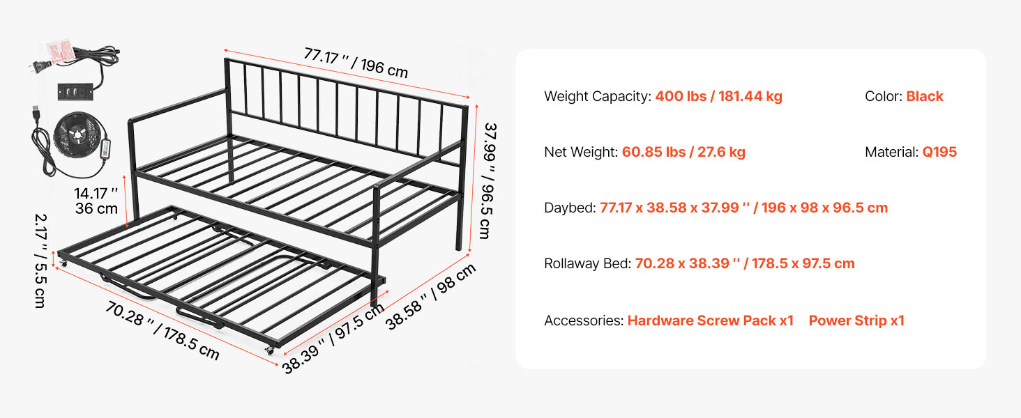 | Denná posteľ | 77.17 x 38,58 x 37,99 palcov / 196 x 98 x 96,5 cm |
