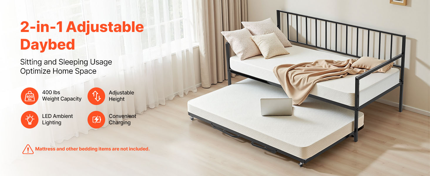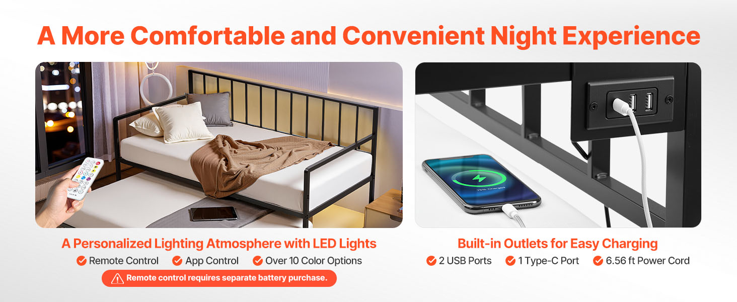 Táto denná posteľ integrovaná s farebnými LED svetlami a multifunkčnými nabíjacími portmi poskytuje viac ako 10 možností osvetlenia a pohodlné funkcie nabíjania, ktoré vám zabezpečia, že zostanete pod napätím a zároveň zažijete personalizované osvetlenie.