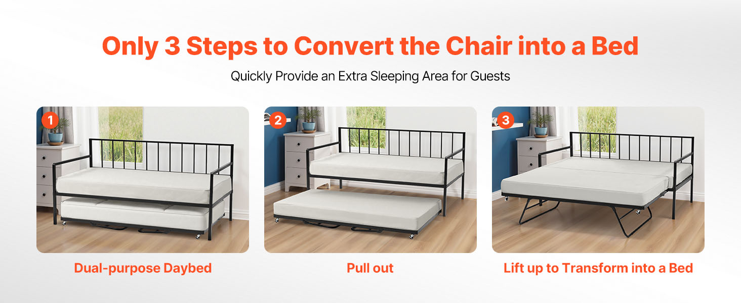 Túto dvojúčelovú dennú posteľ možno bez námahy premeniť na pohodlné lôžko pomocou jednoduchého výsuvného a zdvíhacieho mechanizmu, čím sa zabezpečí ďalšia plocha na spanie pre hostí a zároveň sa maximalizuje priestor a poskytne pohodlie pri každodennom používaní.
