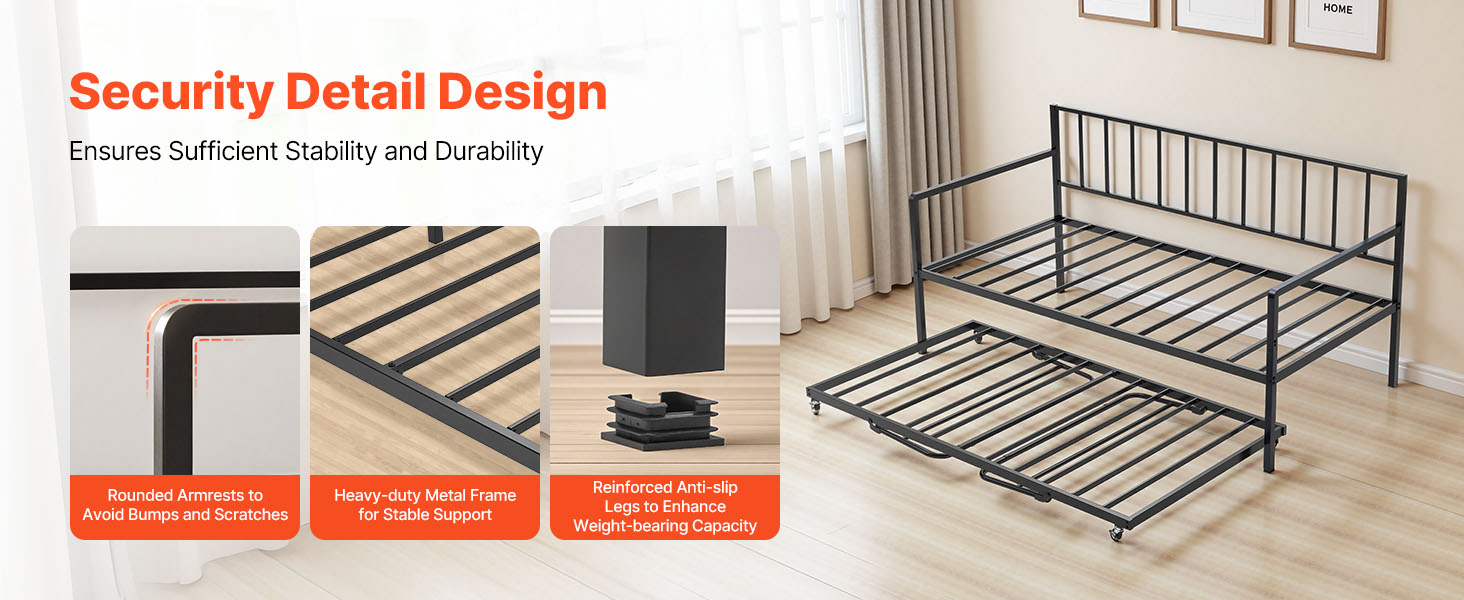 Táto kovová denná posteľ je navrhnutá s ohľadom na bezpečnosť a je vybavená zaoblenými podrúčkami, kovovým rámom odolným proti hrdzi a zosilnenými protišmykovými nohami, ktoré zabezpečujú výnimočnú stabilitu pri každodennom používaní.