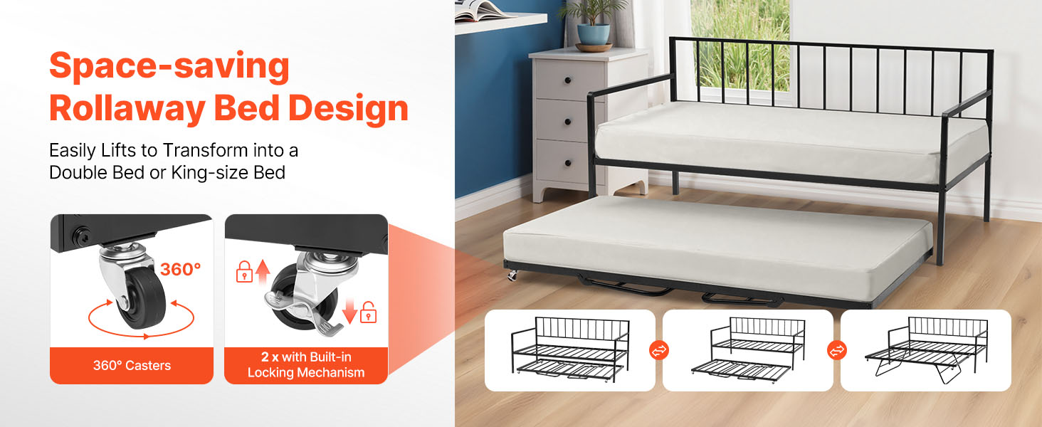 Vďaka vybaveniu 2 hladko sa otáčajúcimi kolieskami a 2 uzamykateľnými kolieskami môžete dennú posteľ ľahko zdvihnúť a premeniť ju na manželskú posteľ vedľa seba alebo na manželskú posteľ. Stačí umiestniť matrac a zažiť pohodlný spánok.