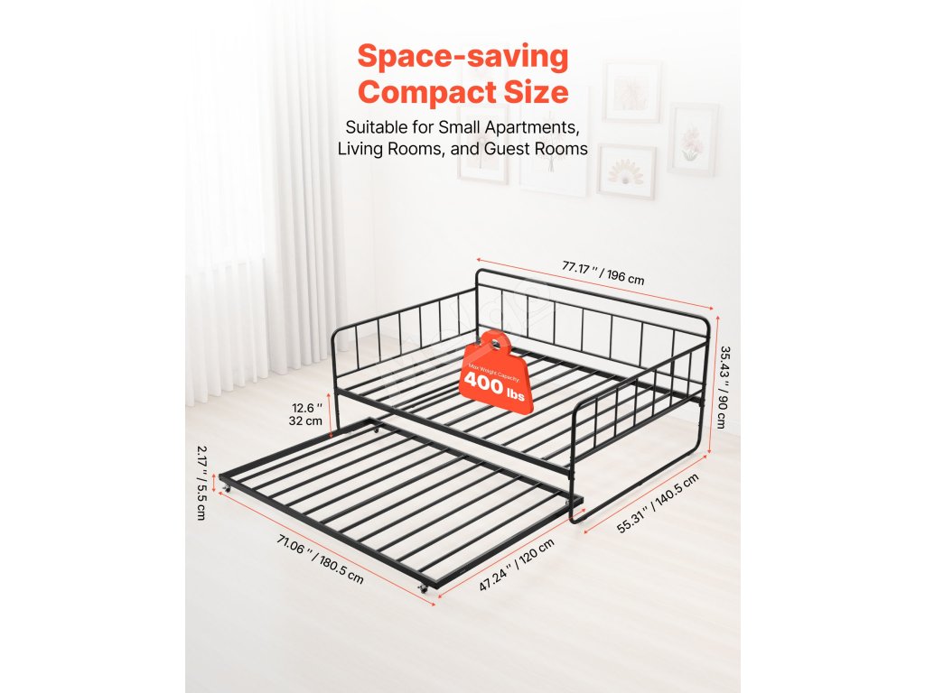 Denná posteľ v plnej veľkosti s výsuvným lôžkom, kovový rám, lamely