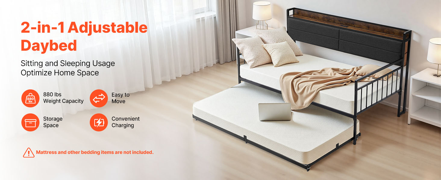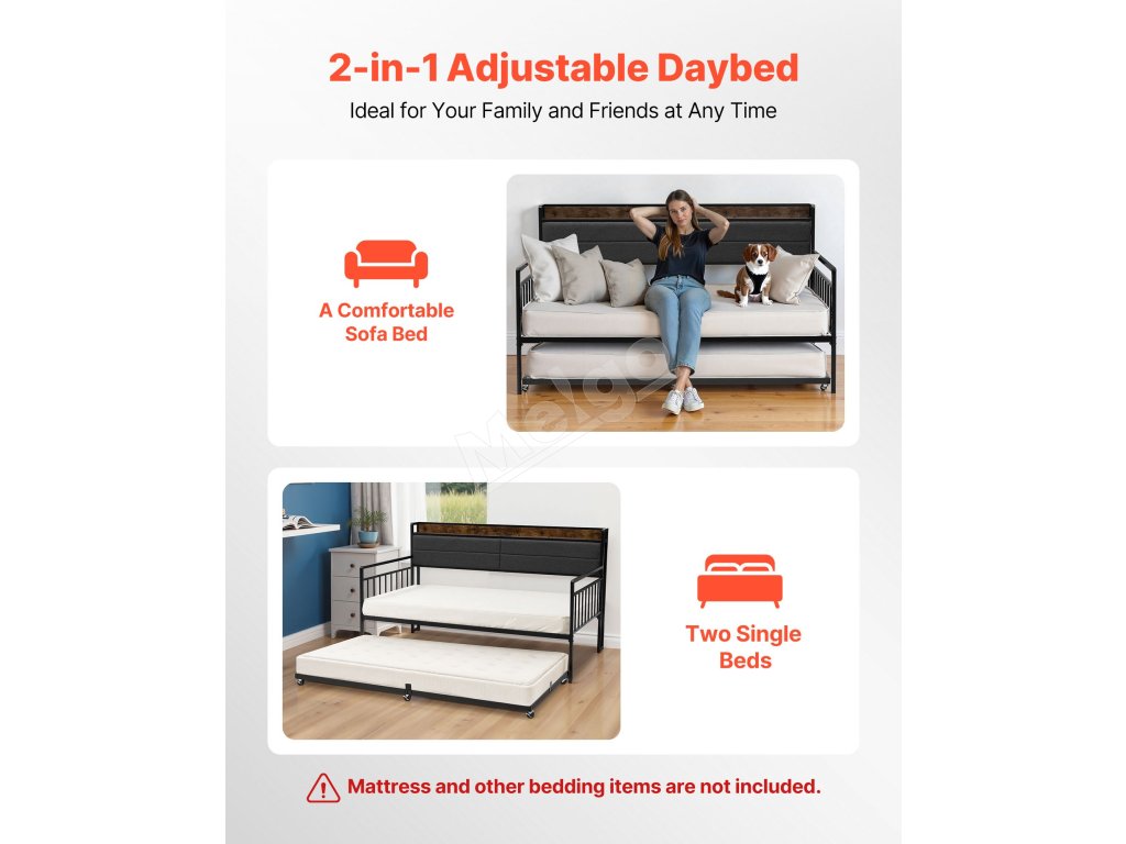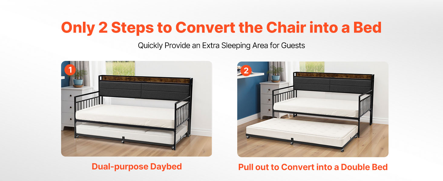 Túto dvojúčelovú dennú posteľ možno jednoduchým vysunutím bez námahy premeniť na pohodlnú posteľ, ktorá poskytuje ďalší priestor na spanie pre hostí a zároveň maximalizuje efektívnosť využitia priestoru a poskytuje pohodlie pri každodennom používaní.