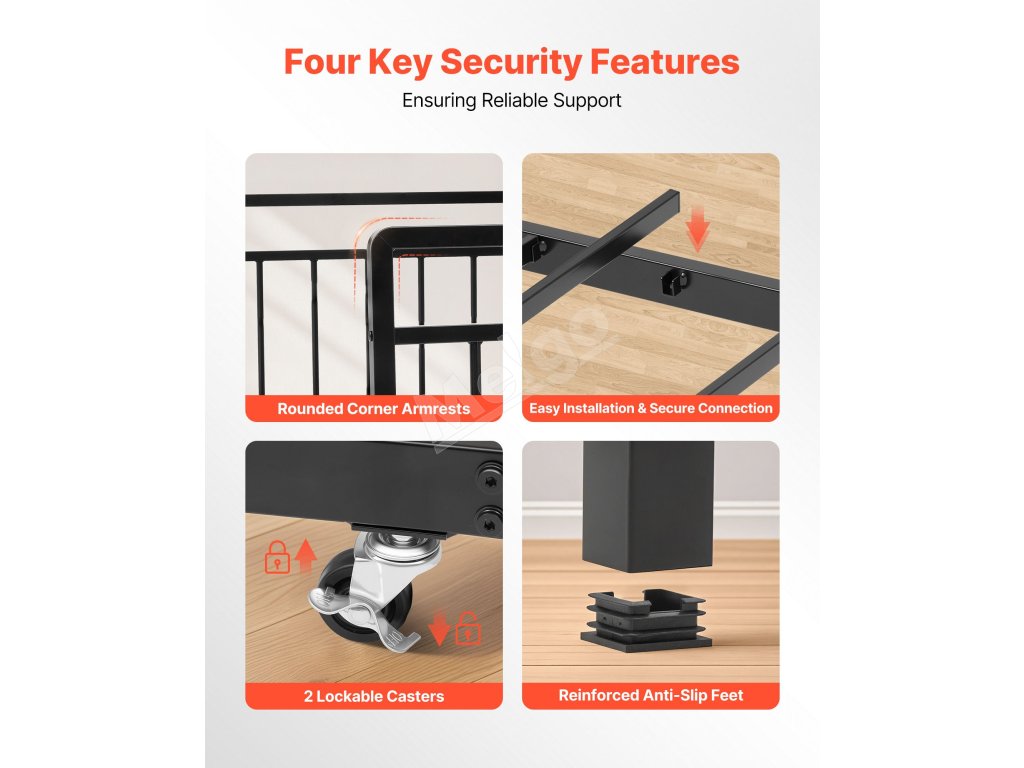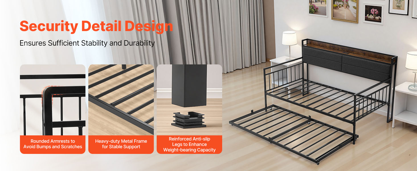 Táto kovová denná posteľ je vybavená bezpečnostnými zaoblenými podrúčkami, kovovým rámom odolným proti hrdzi a zosilnenými protišmykovými nožičkami, ktoré poskytujú výnimočnú stabilitu pri každodennom používaní.