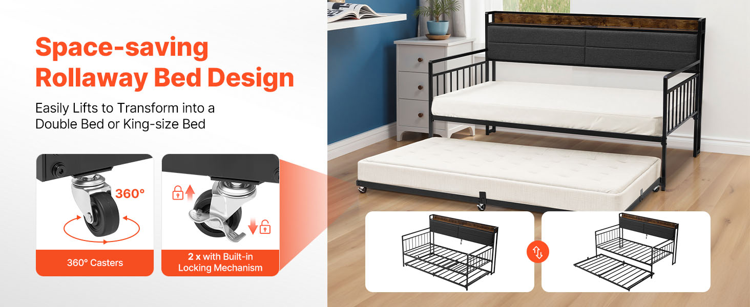 Vďaka vybaveniu 2 hladko sa otáčajúcimi kolieskami a 2 uzamykateľnými kolieskami môžete dennú posteľ jednoducho vysunúť a premeniť ju na manželskú posteľ vedľa seba alebo na manželskú posteľ. Stačí umiestniť matrac a zažiť pohodlný spánok.