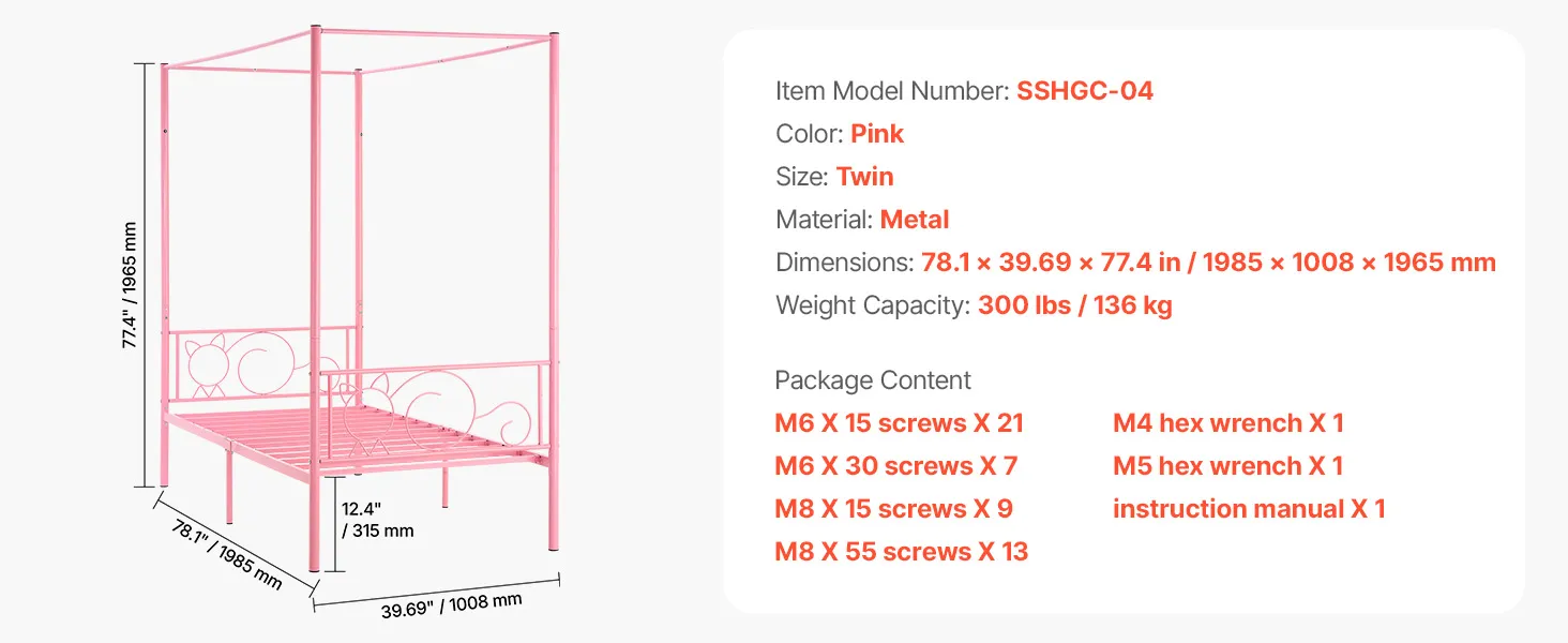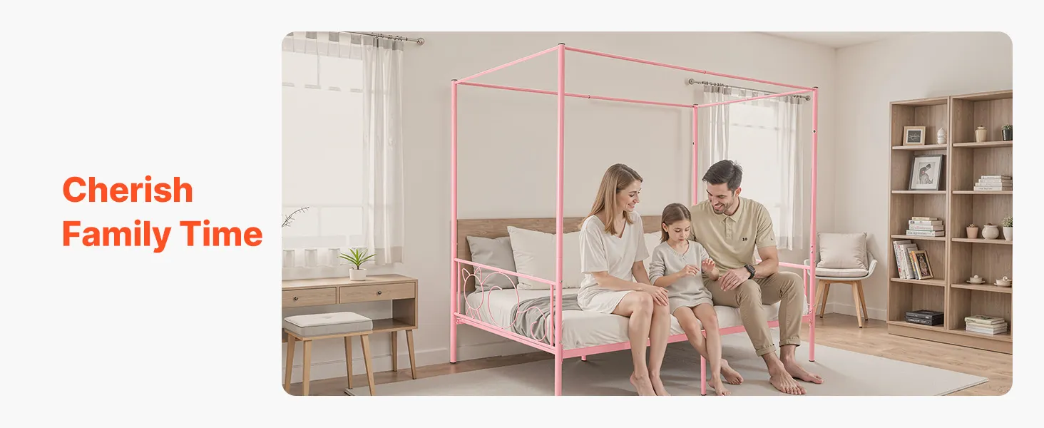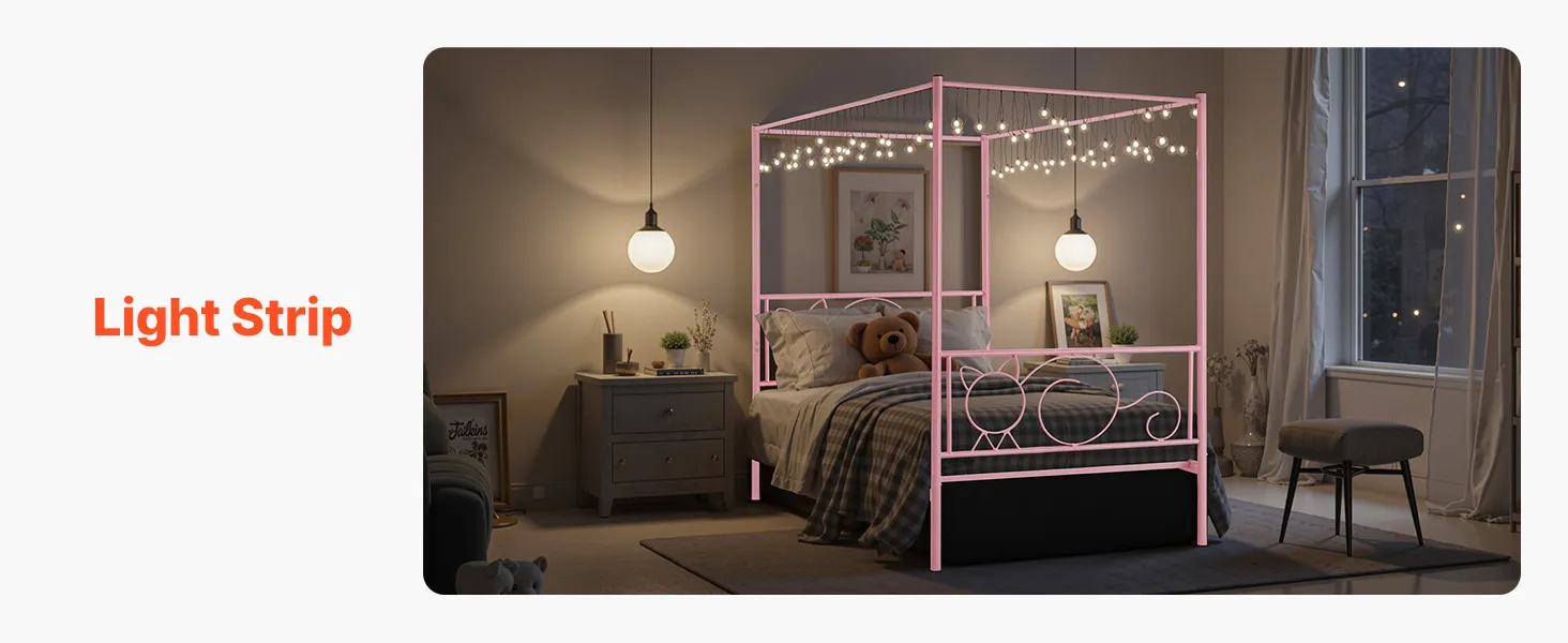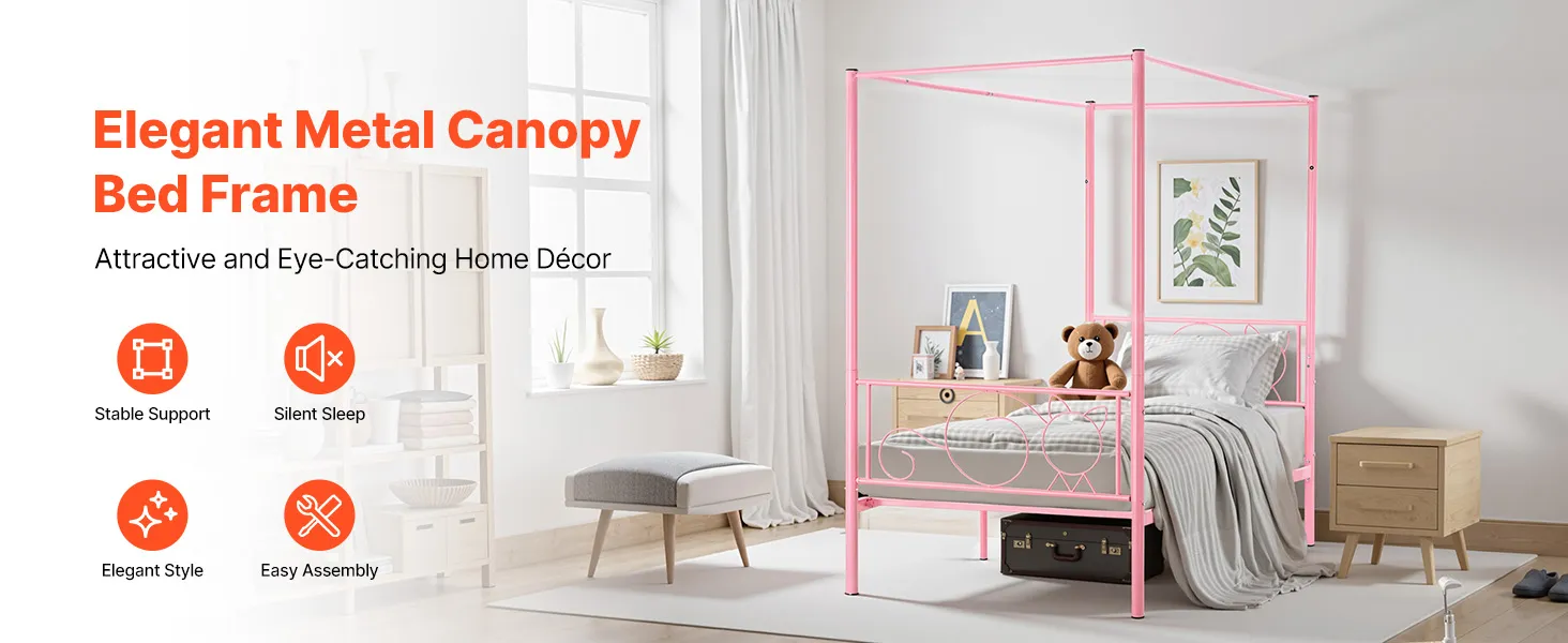 Kovová twin posteľ s 4 stĺpmi, úložný priestor, lamely, ružová