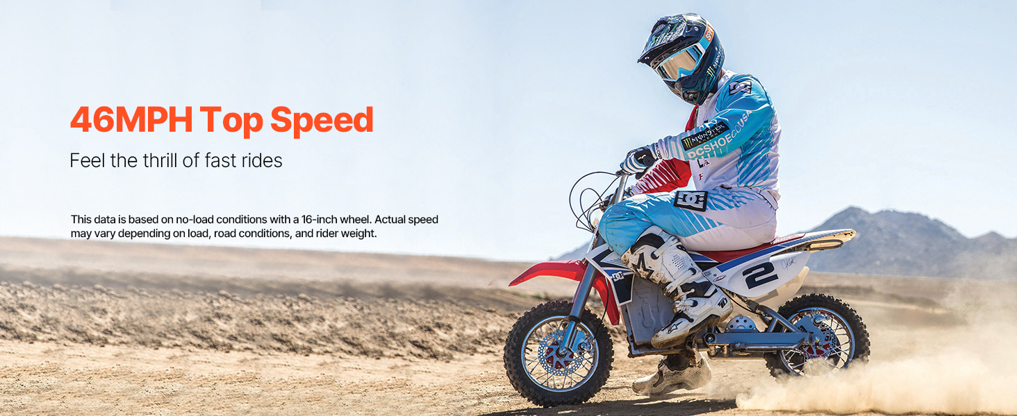 Zažite dokonalé vzrušenie s rýchlosťou 46 MPH bez zaťaženia! Pocíťte radosť z rýchlej jazdy, vďaka ktorej bude každá cesta nezabudnuteľná. (Táto maximálna rýchlosť je založená na podmienkach bez zaťaženia so 16-palcovým kolesom - skutočná rýchlosť sa môže líšiť v závislosti od zaťaženia, podmienok na ceste a hmotnosti jazdca)