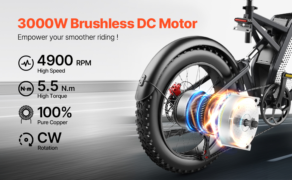 Vylepšite svoju jazdu s istotou a zažite vyšší výkon, spoľahlivosť a potešenie vďaka bezkartáčovému jednosmernému motoru s výkonom 72 V a výkonom 3000 W, pôsobivému menovitému krútiacemu momentu 5,5 N.m, vysokej rýchlosti a ovládaniu smeru jazdy v smere CW. Bez námahy zdolávajte stúpania do kopca a s ľahkosťou prekonávajte náročné terény.