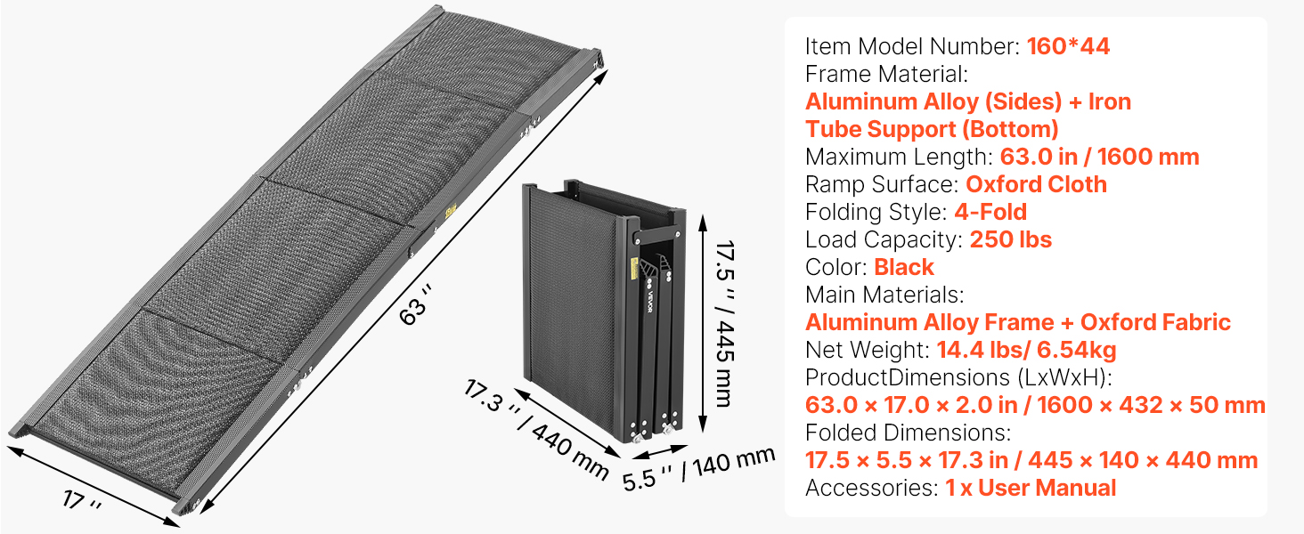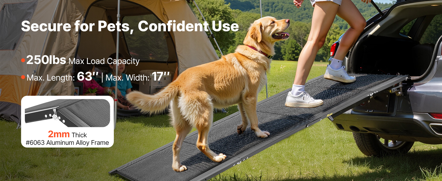 Táto 63 in predĺžená rampa pre domáce zvieratá s vysokopevnostným hliníkom 6063 a 2 mm zosilneným rámom unesie až 250 libier. Robustná konštrukcia zabraňuje kývaniu a protišmykový povrch udržiava stabilitu domácich zvierat pri pohybe nahor alebo nadol.