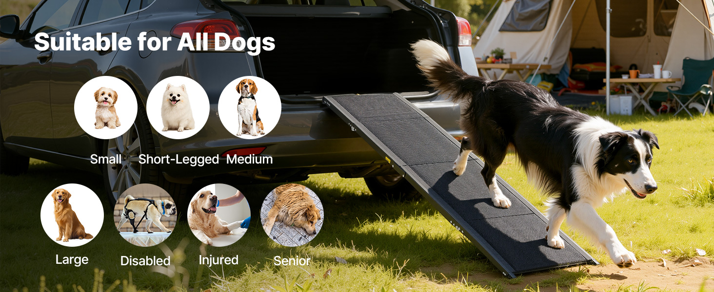Skladacia rampa pre psov je ideálna pre psov všetkých veľkostí a podmienok vrátane malých, krátkonohých, stredných, veľkých, starších, zranených alebo postihnutých domácich zvierat.