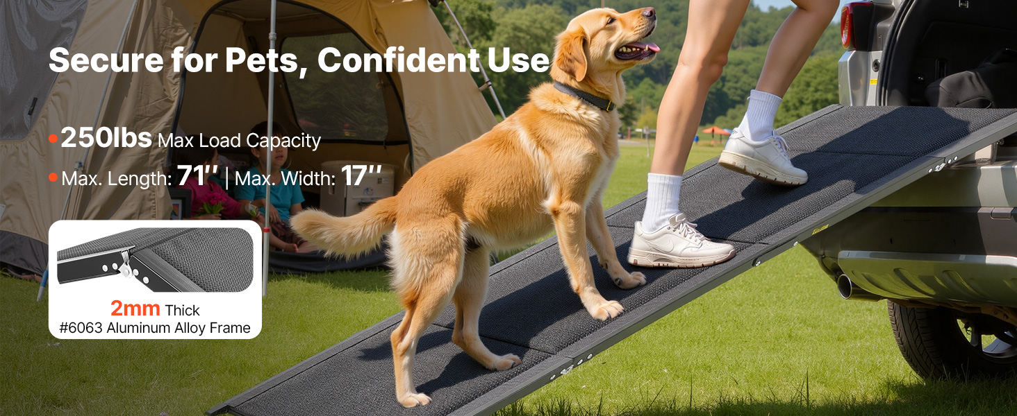 Táto 71 v predĺžená rampa pre domáce zvieratá s vysokopevnostným hliníkom 6063 a 2 mm zosilneným rámom unesie až 250 libier. Robustná konštrukcia zabraňuje kývaniu a protišmykový povrch udržiava stabilitu domácich zvierat pri pohybe nahor alebo nadol.