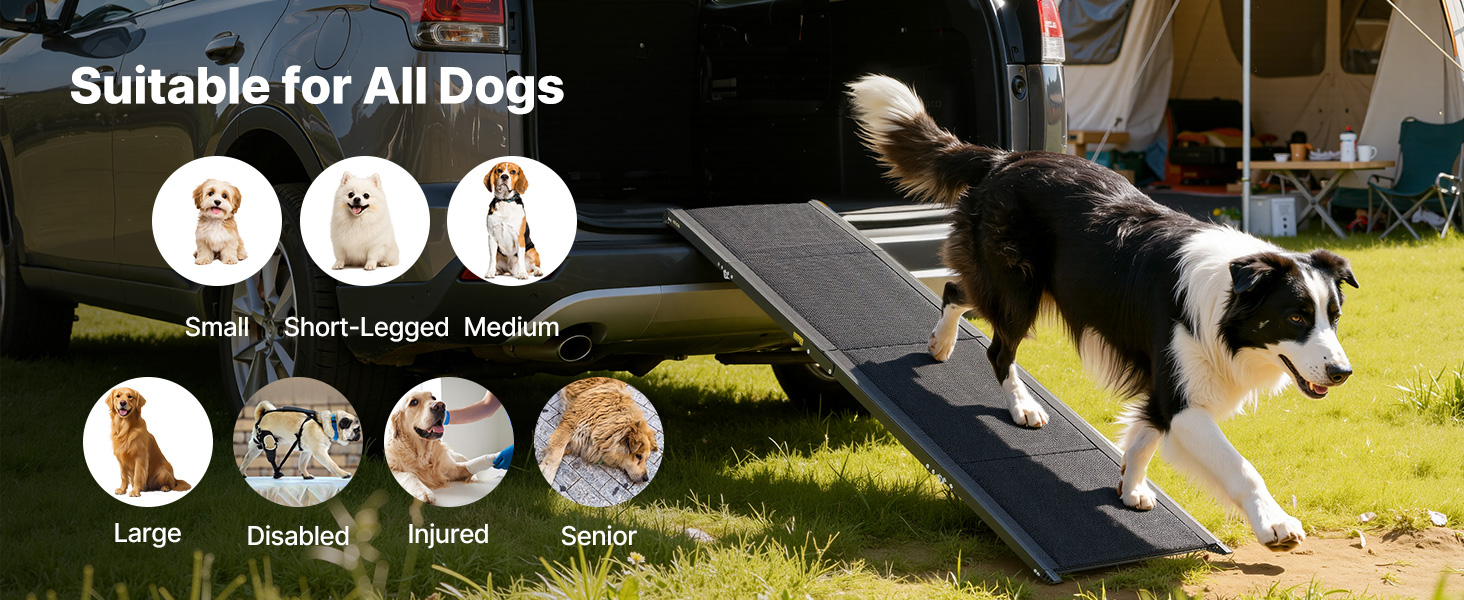 Skladacia rampa pre psov je ideálna pre psov všetkých veľkostí a podmienok vrátane malých, krátkonohých, stredných, veľkých, starších, zranených alebo postihnutých domácich zvierat.